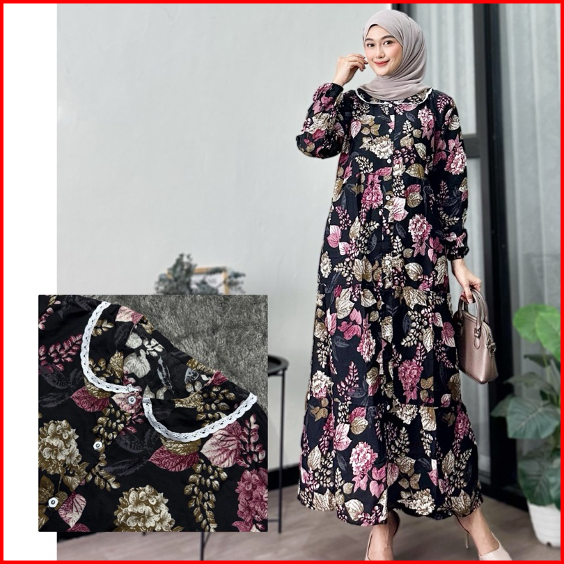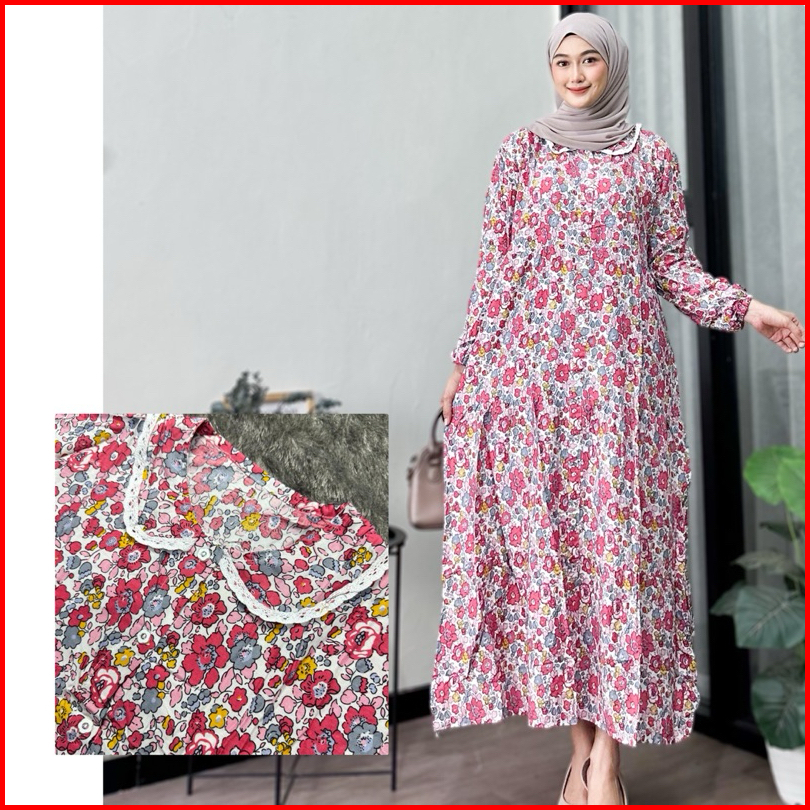 Gamis Midi Dress Rayon Motif Bunga Bahan Rayon Viscos Terlaris Ld 115 Pb 135 Katun Flowy Dress Busui Friendly Adem Fit N