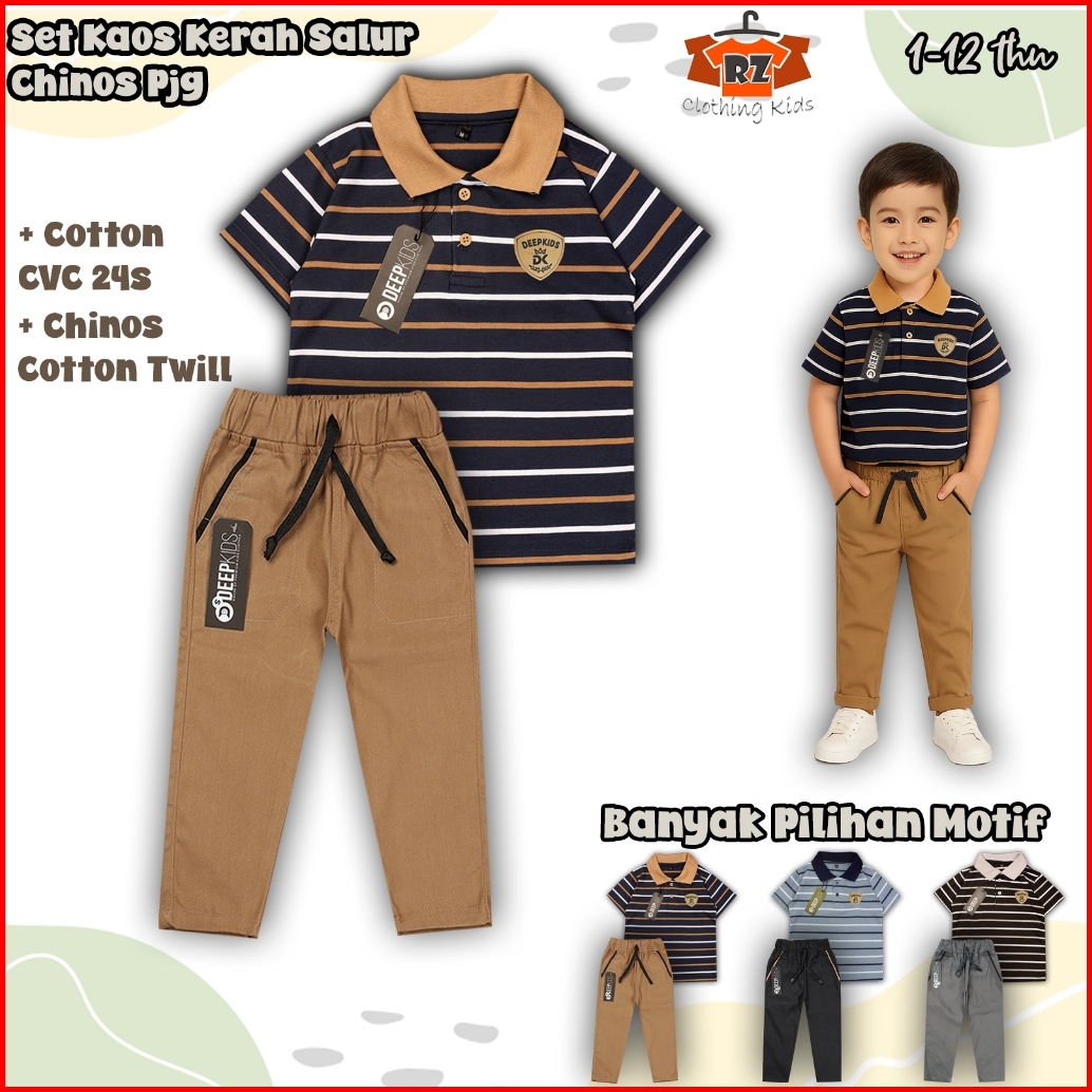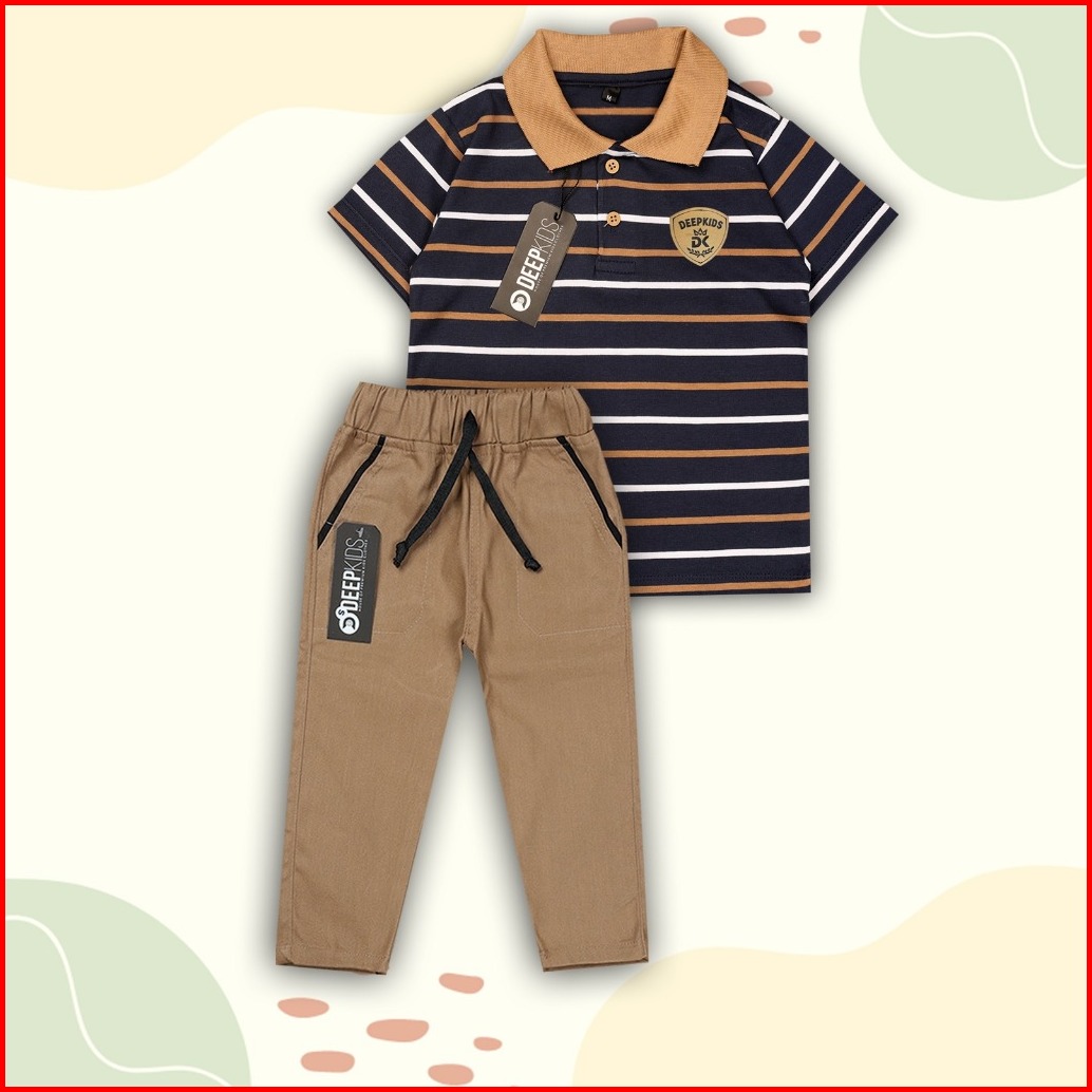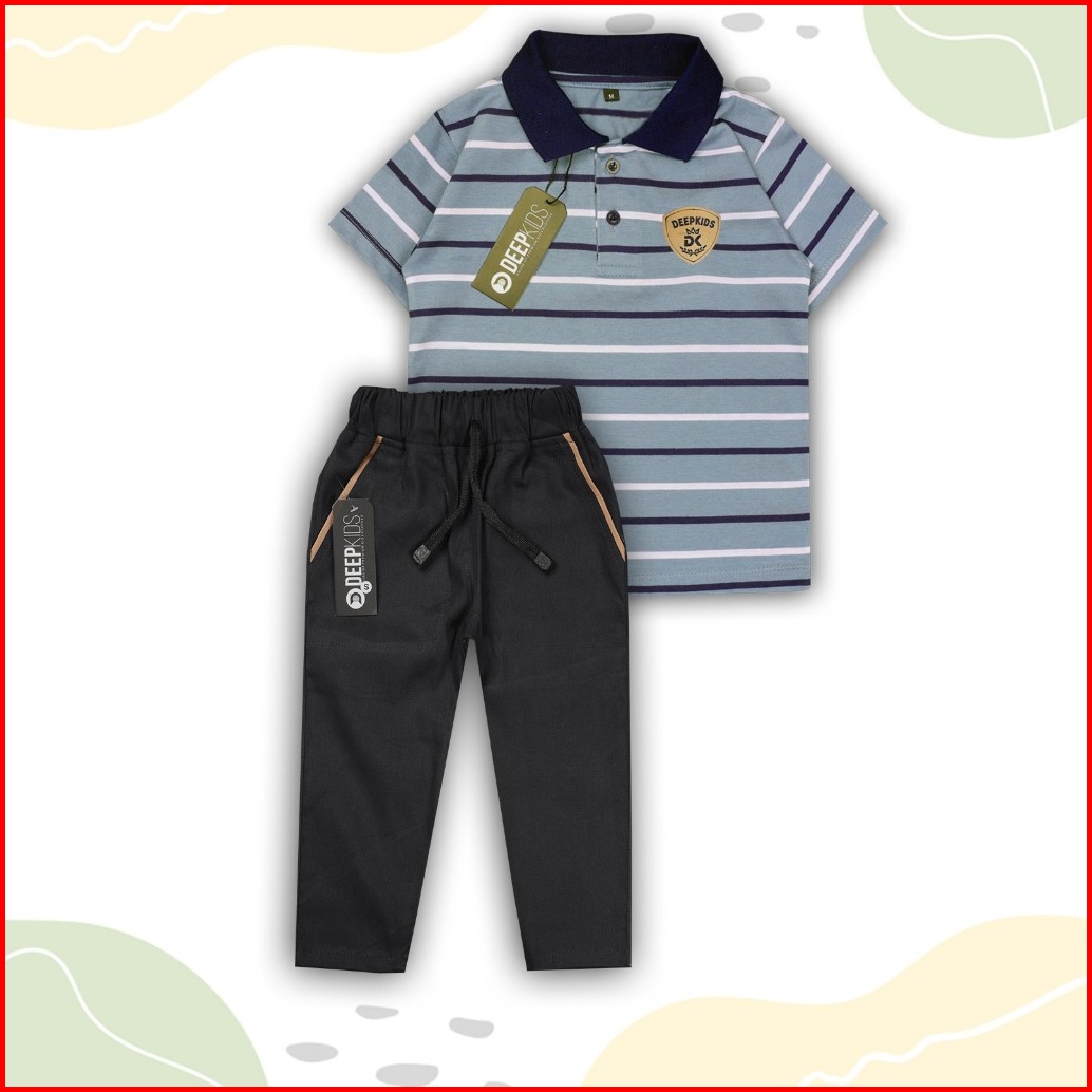 Setelan Anak Laki Laki Kaos Kerah Salur Celana Chinos Panjang Premium Usia 1-12 Tahun Set Stevada Chinos Pjg
