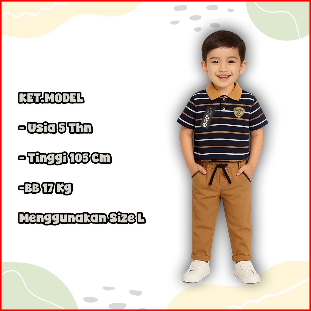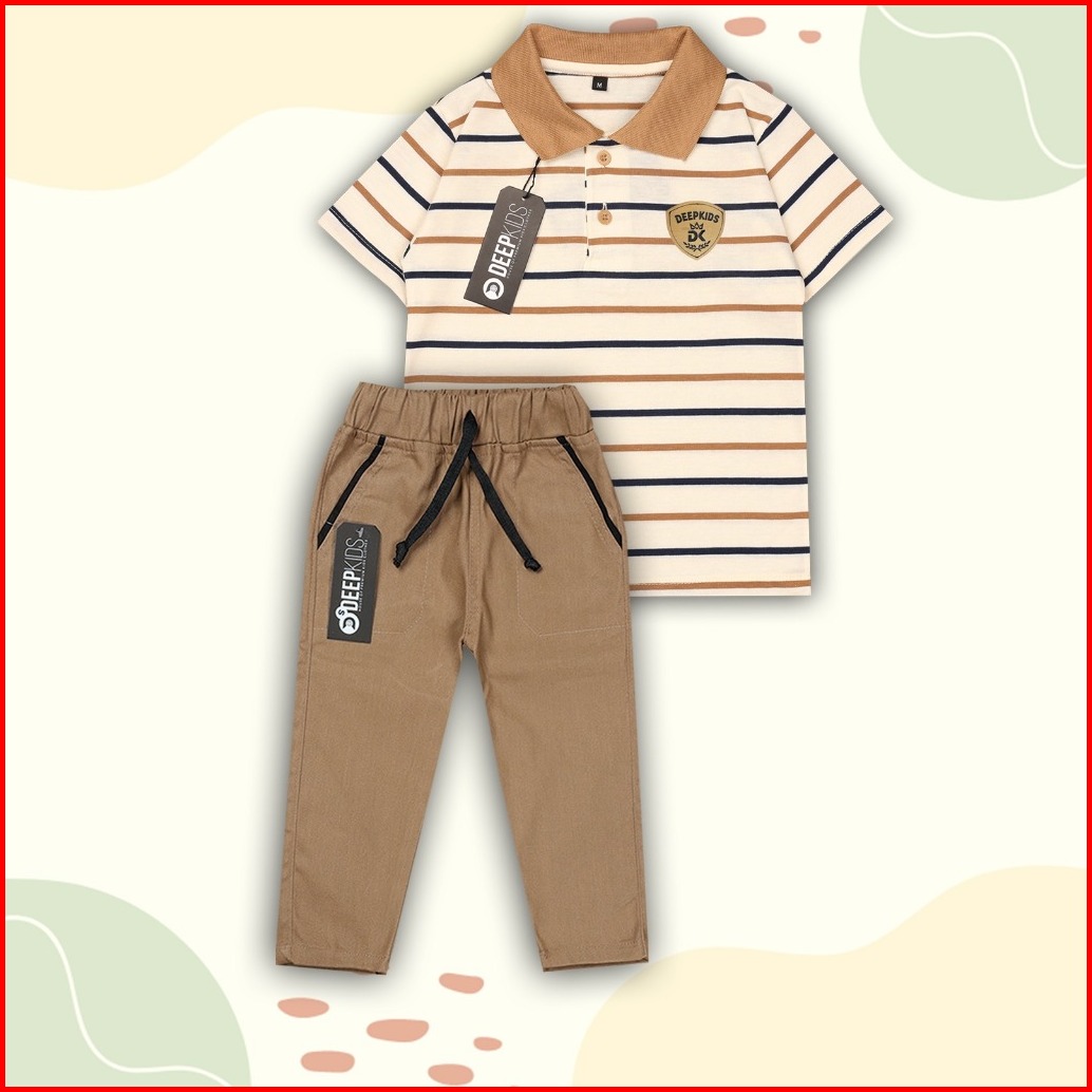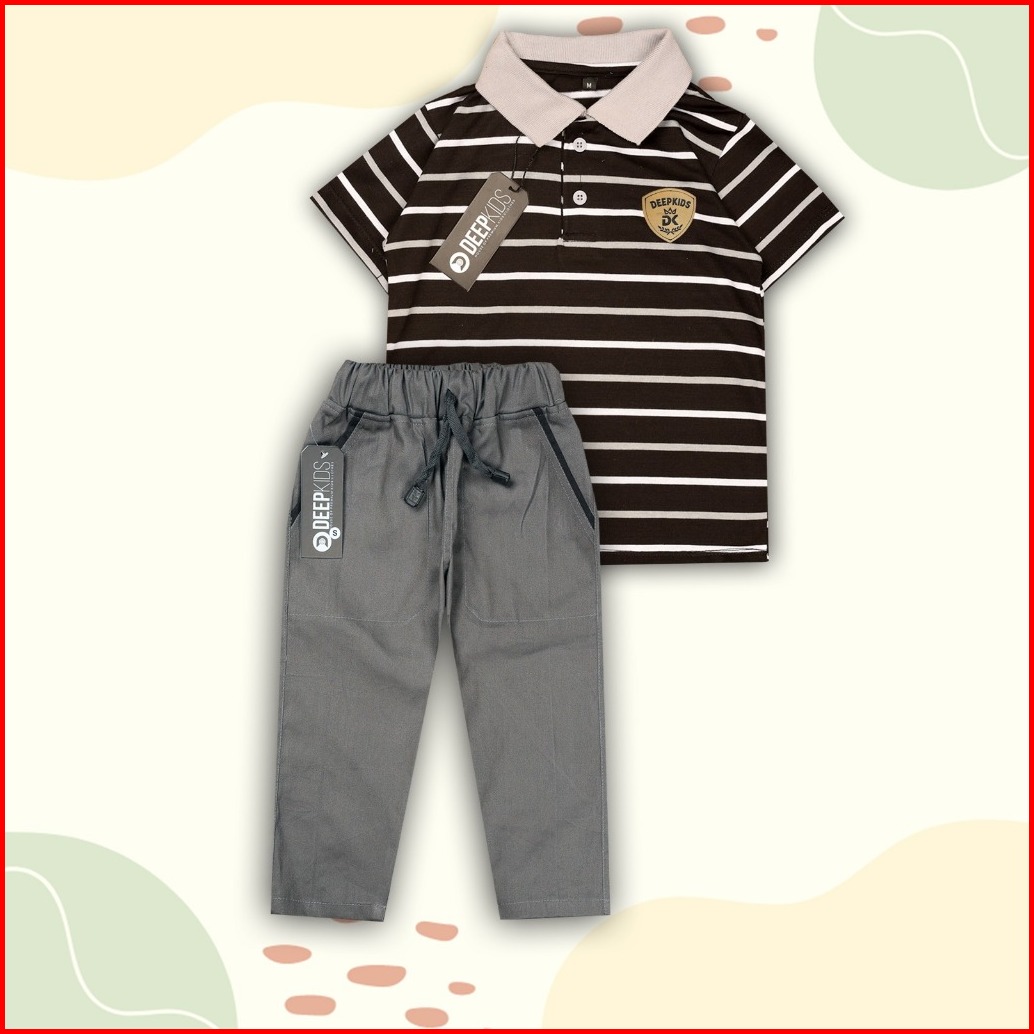 Setelan Anak Laki Laki Kaos Kerah Salur Celana Chinos Panjang Premium Usia 1-12 Tahun Set Stevada Chinos Pjg