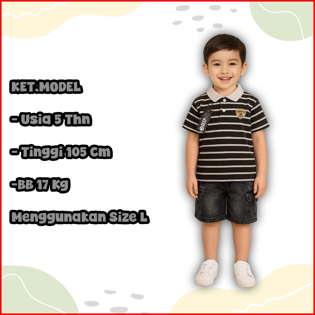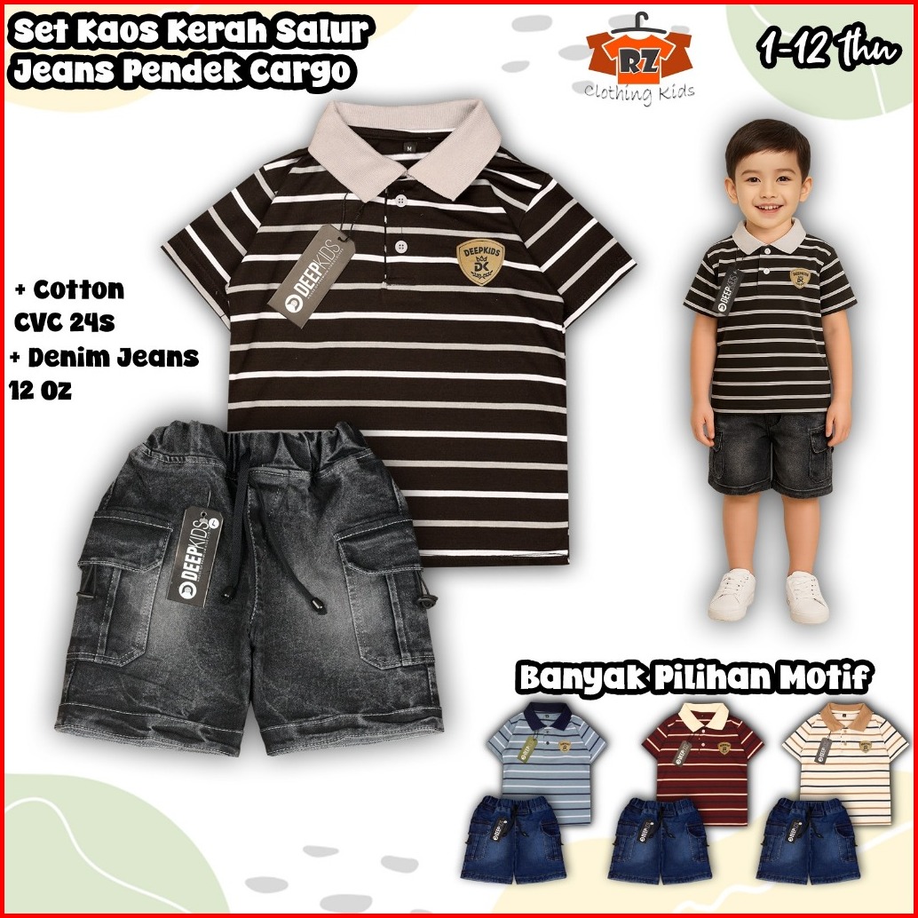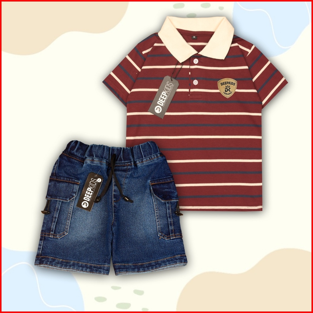 Deepkids Setelan Anak Laki Laki Baju Kaos Kerah Salur Celana Jeans Cargo Pendek Bahan Cotton Cvc 24s Jeans Cargo Usia 1