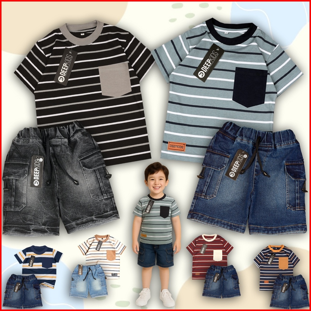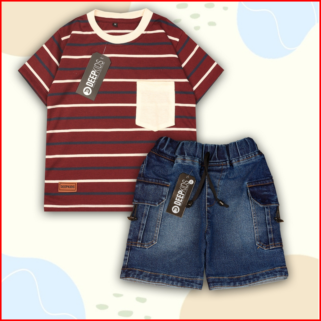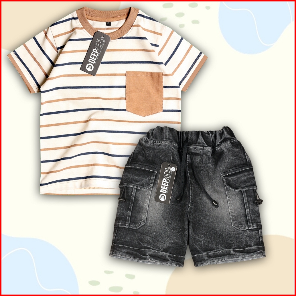 Setelan Anak Laki Laki Kaos Salur Pocket Celana Jeans Cargo Pendek Premium Usia 1-12 Tahun Set Kamada Jpo