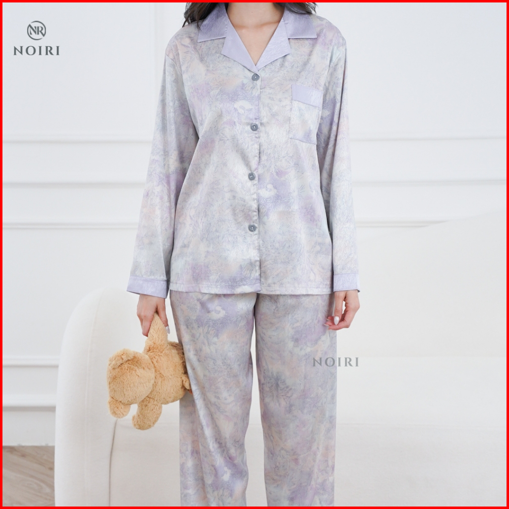 Noiri - Baju Tidur Lengan Panjang Setelan One Set Wanita Dewasa Motif Lilac Paint Minimalis Korean Style Piyama Sutra Es