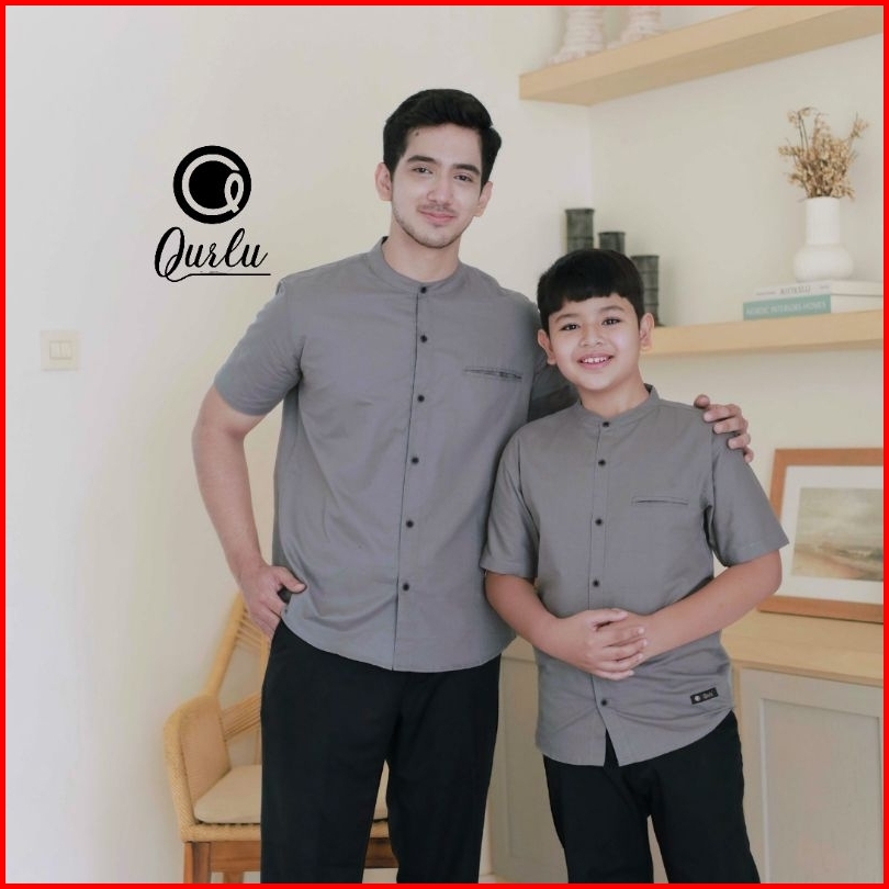 Qurlu - Kemeja Koko Dewasa Anak Warna Grey Abu Sedang Baju Couple Ayah Dan Anak Laki-laki Baju Koko Pria