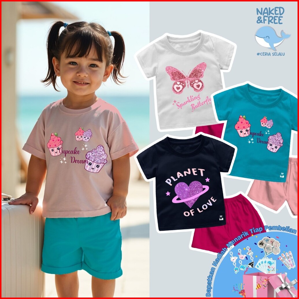 Naked Free Setelan Kaos Pendek Bayi Anak Perempuan Glitter Series Cupcake Love Bahan Katun Gli-1