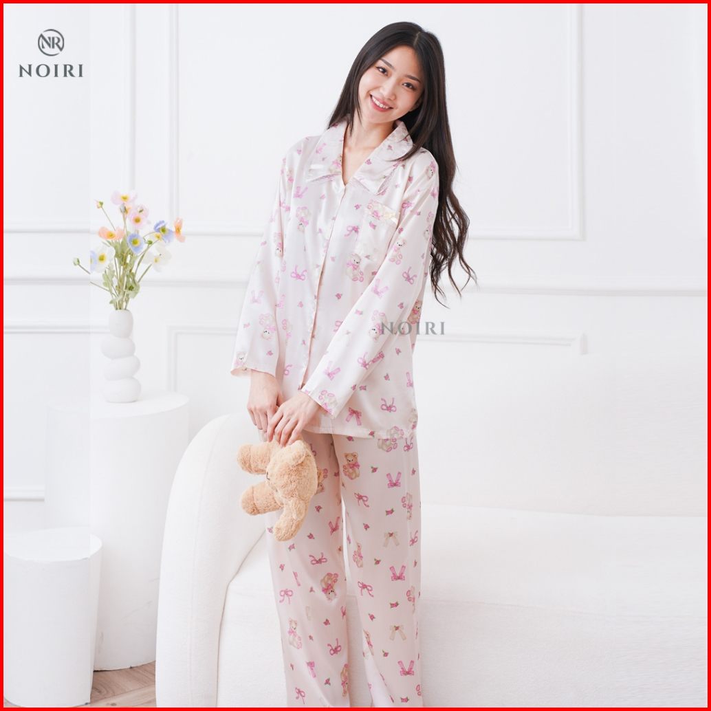 Noiri - Piyama Bear Coquette Baju Tidur Lengan Panjang Setelan One Set Dewasa Motif Bear Pink Pita Korean Style Piyama S