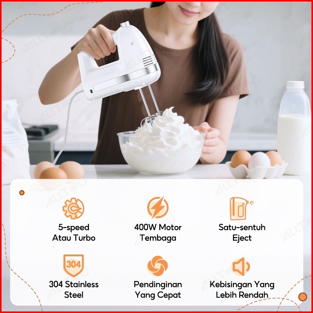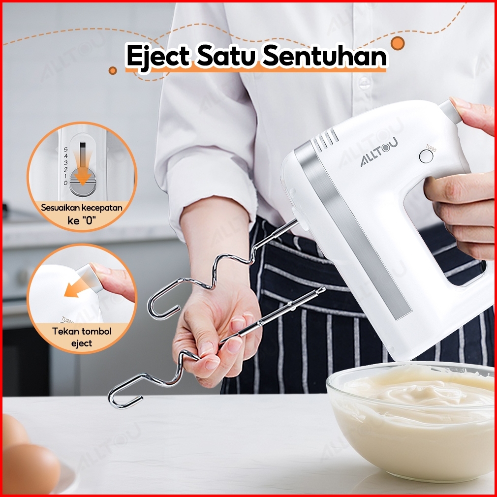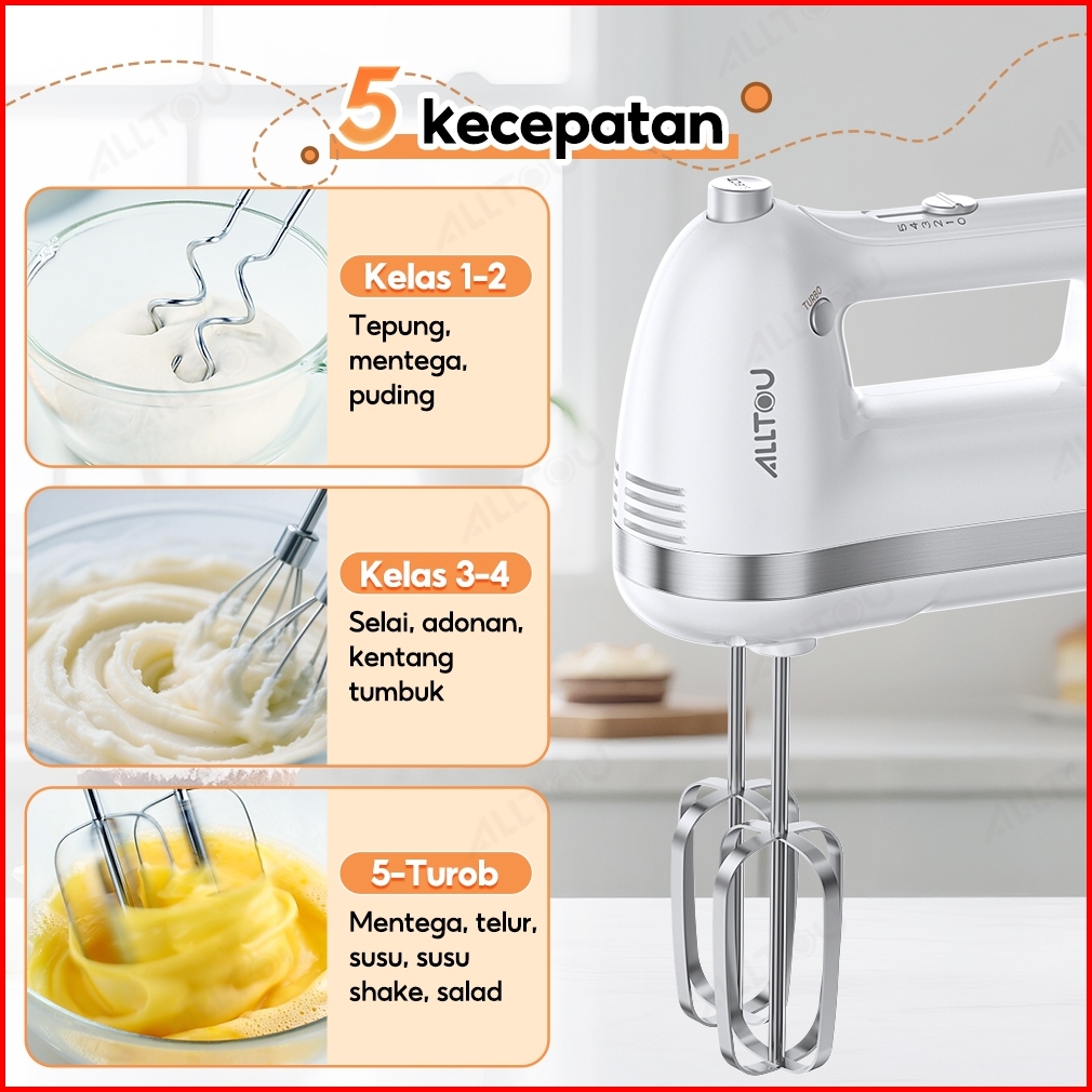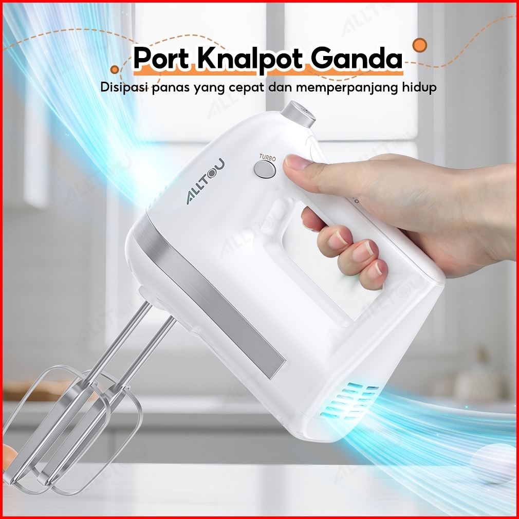 Alltou Hand Mixer Fungsi Turbo Pengaduk 5 Kecepatan Hand Mixer Free 6 Buah Alat Pengocok Putih