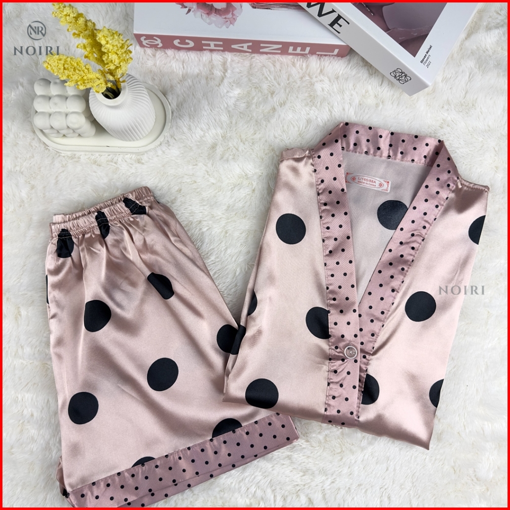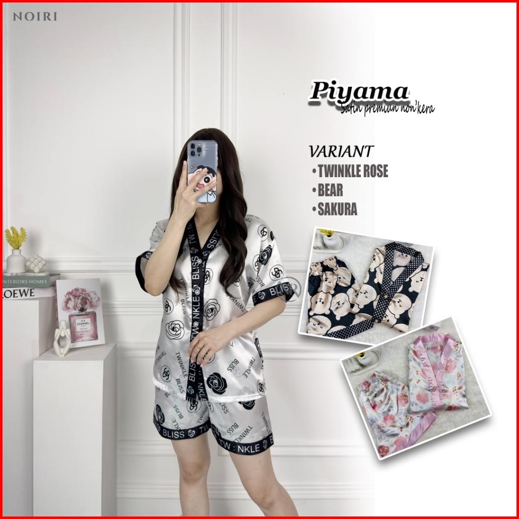 Noiri - 1 Sakura Bear Rose Piyama Wanita Satu Set Satin Celana Pendek Lengan Pendek Bahan Satin Premium Baju Tidur Setel