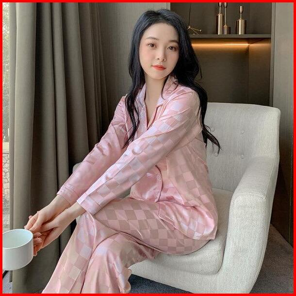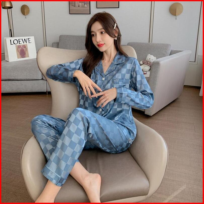 017 Ultra Luxury Sleepwear Kelas Atas Piyama Satin Lengan Panjang Celana Panjang Motif Square Kancing Hidup Satin High Q