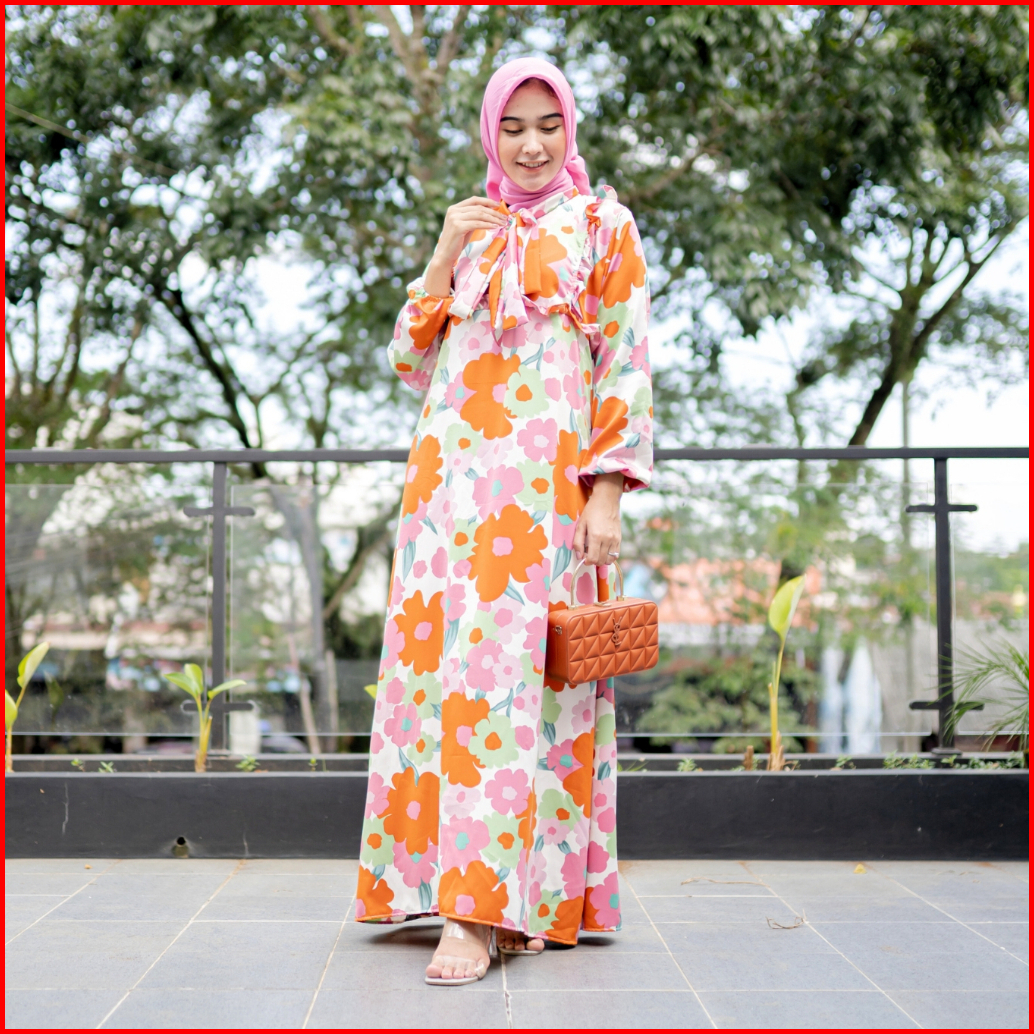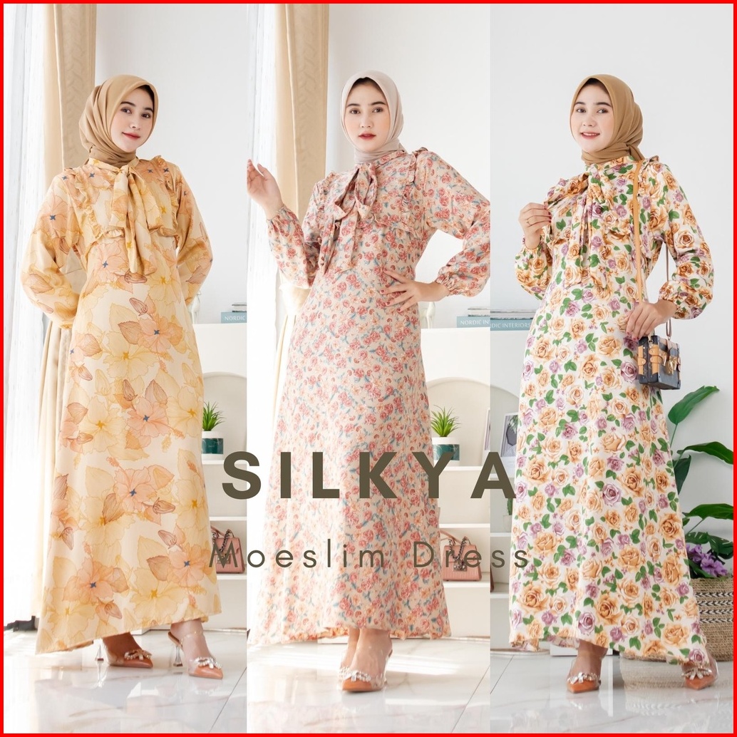 Ademinco Silkya Gamis Kasual Armany Silk Busui Bumil Friendly Leher Tali Pita