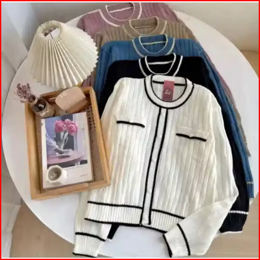Himawari Cardigan Korean Style Rajut Salur Motif Kancing Mutiara Lengan Panjang Wanita Kekinian Knit