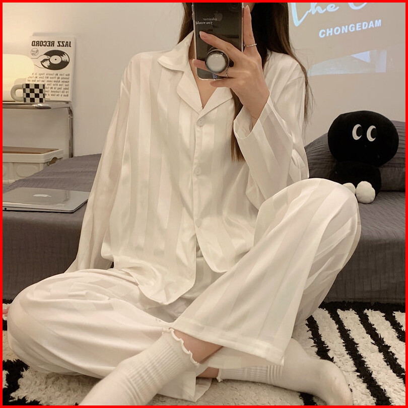 2024 Set Piyama Satin Baru Bergaris-garis Pakaian Rumah Wanita Lengan Panjang