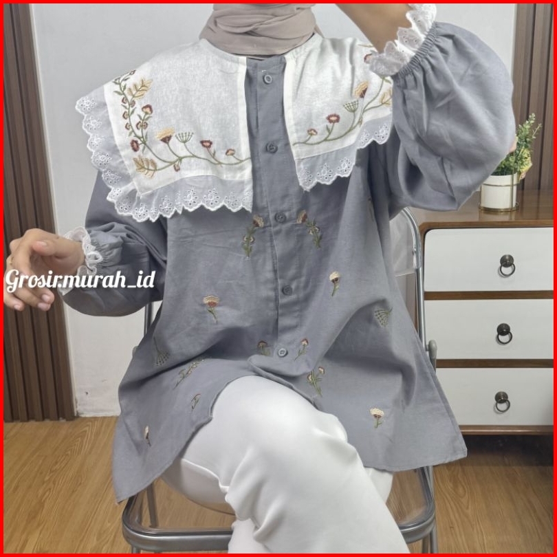 Aleyra Blouse Bordir Linen Bunga-bunga Maron Navy