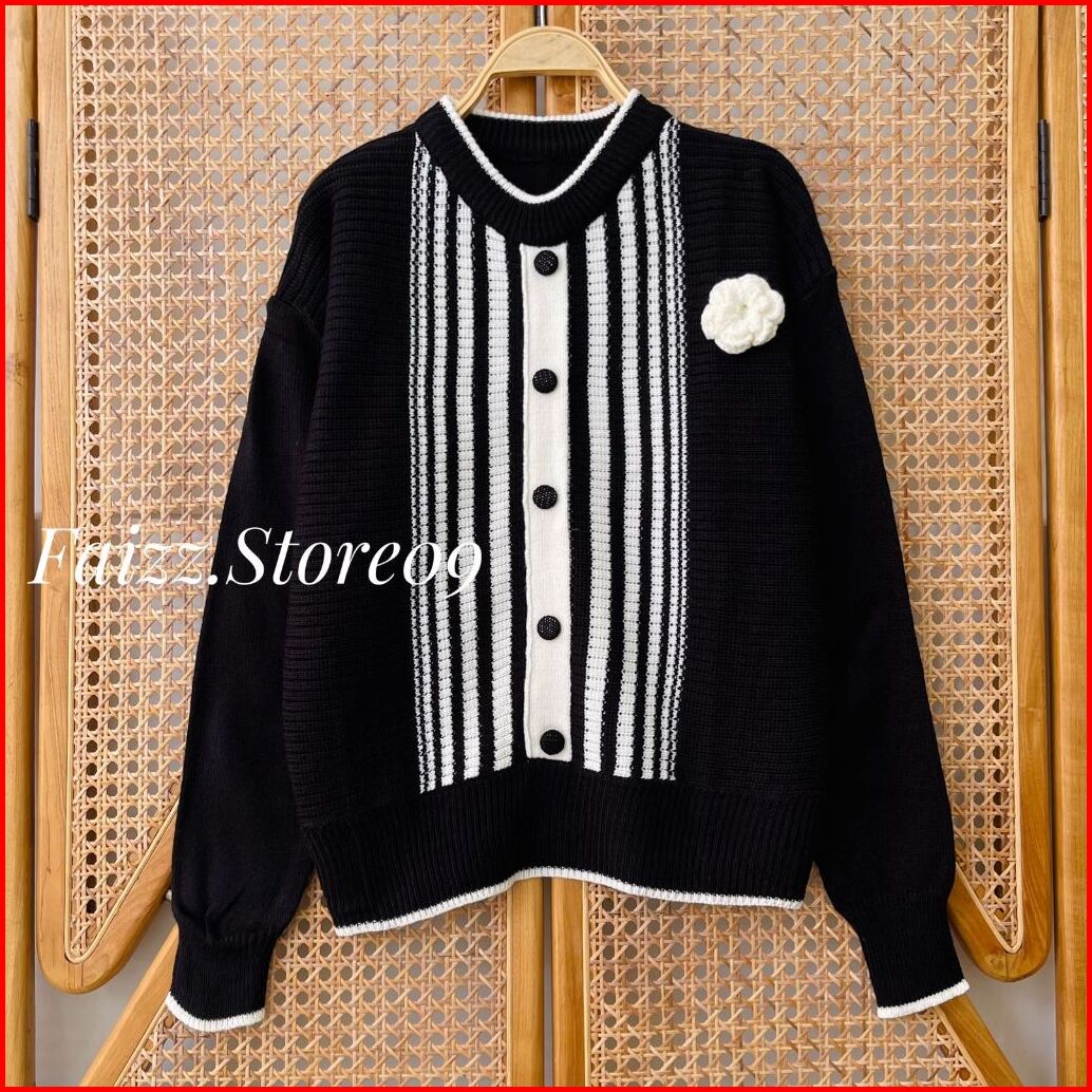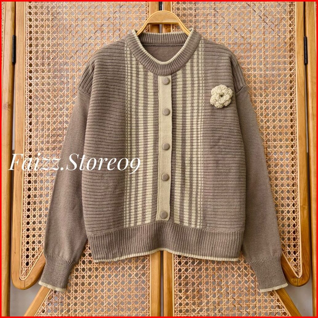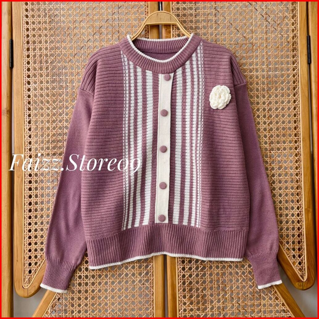 Yuli Blouse Knit - Atasan Sweater Rajut Crop Wanita Motif Kancing Bunga Kerah Bulat Lengan Panjang Korean Style