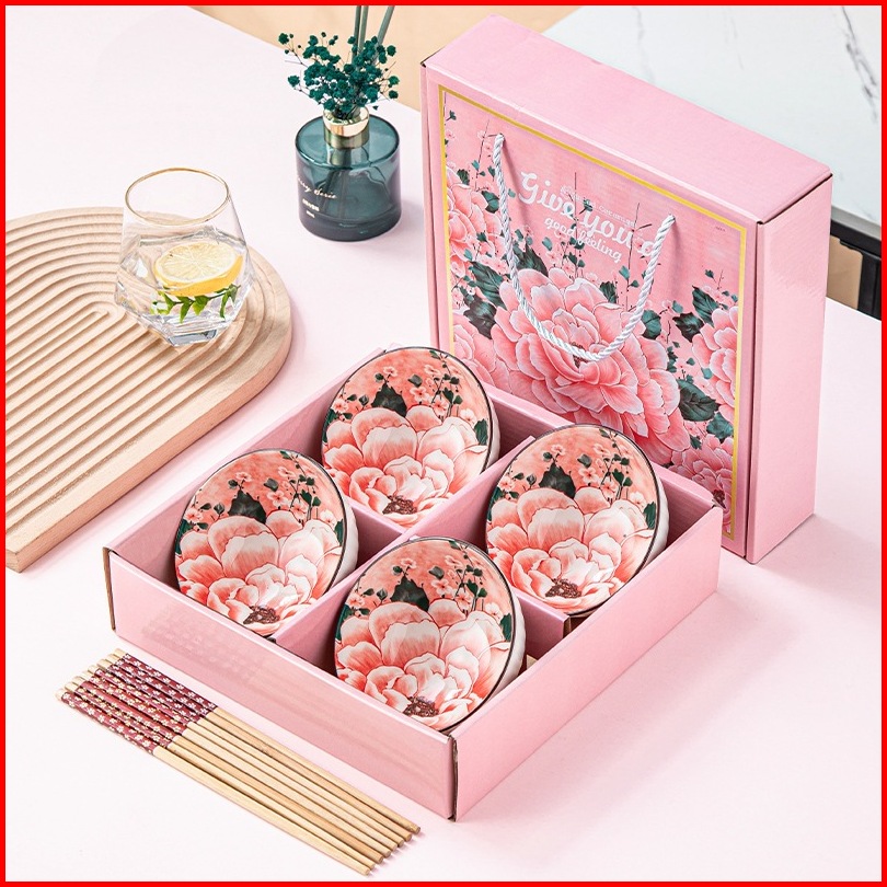 Mangkok Sup Keramik Isi 4 Dilengkapi Sumpit Ceramic Bowl Set Hampers Kado Lebaran Parcel Souvenir Gift Box