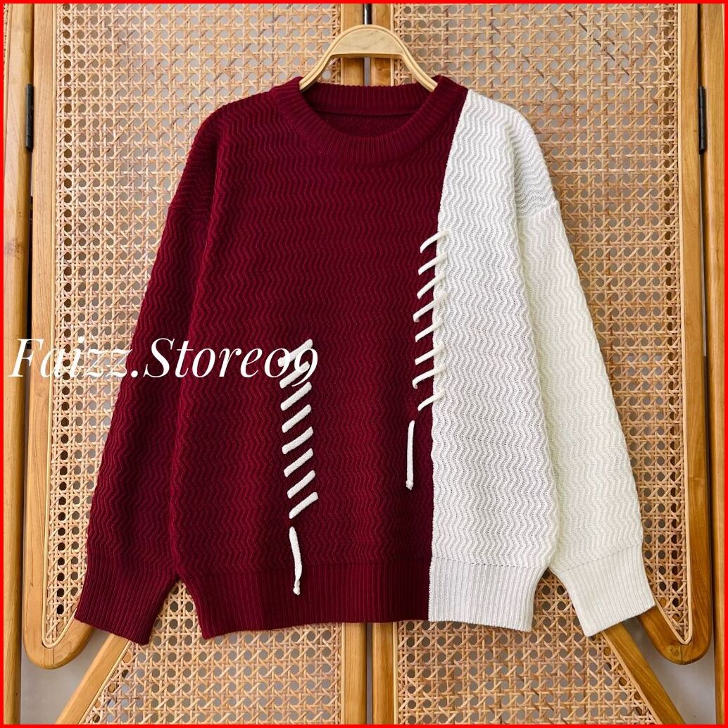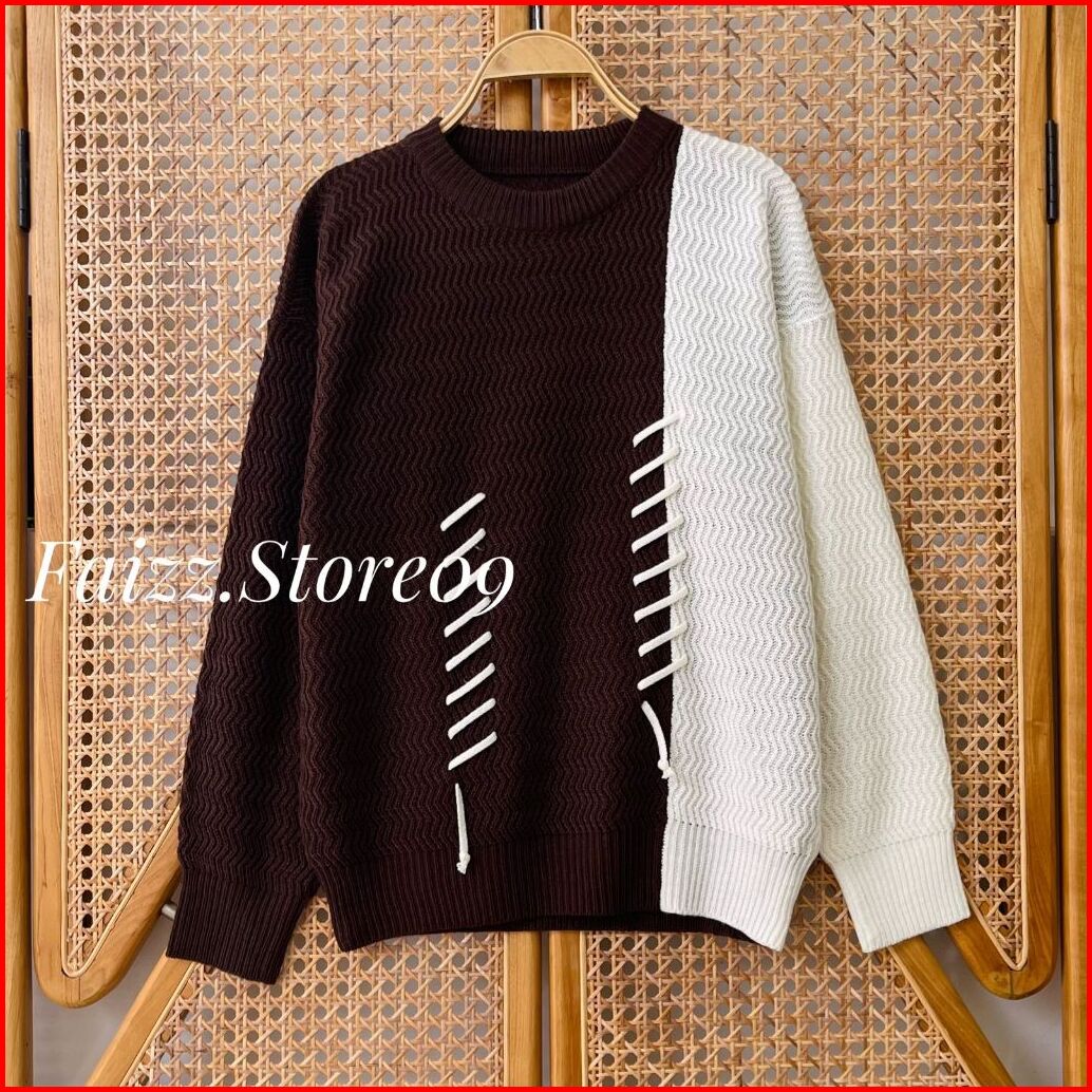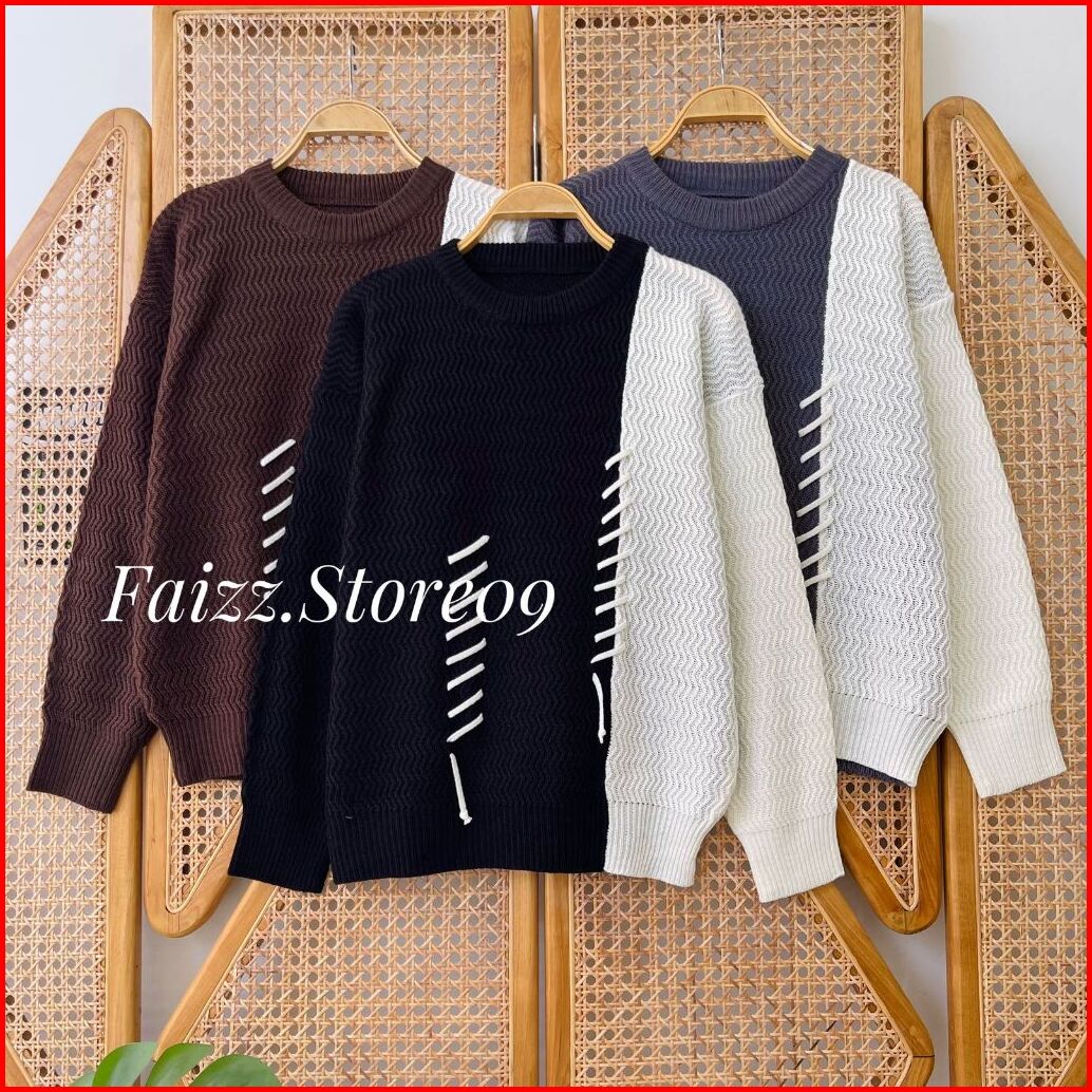 Melvi Blouse Knit - Atasan Sweater Rajut Wanita Two Tone Motif Tali Kur Kerah Bulat Lengan Panjang Korean Style