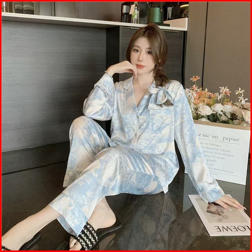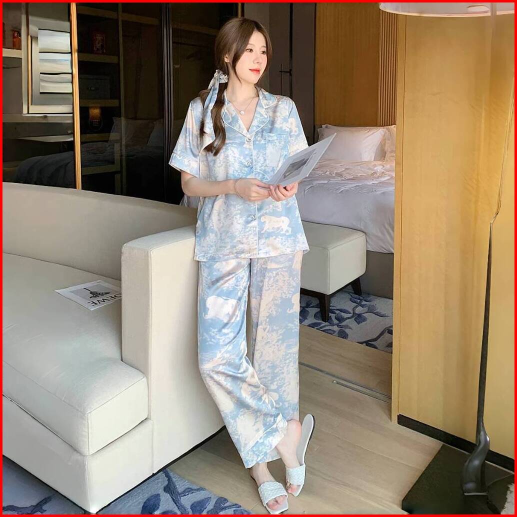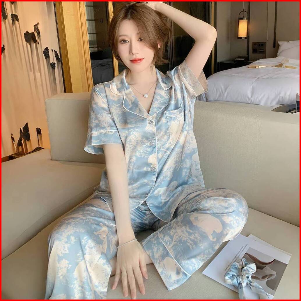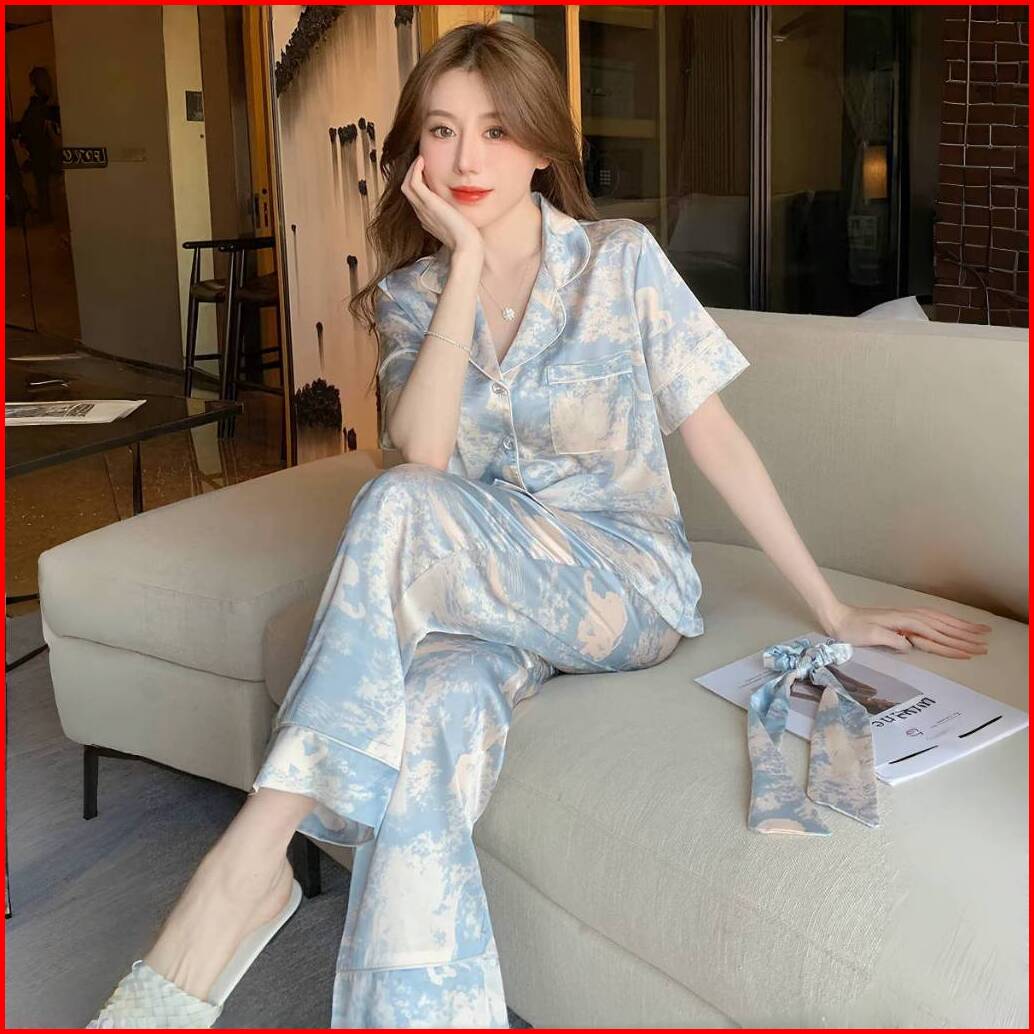 Versi Korea Dari Piyama Wanita Senior Satin Tie-dye Piyama Celana Panjang Celana Panjang Lengan Pendek Satu Set Pakaian