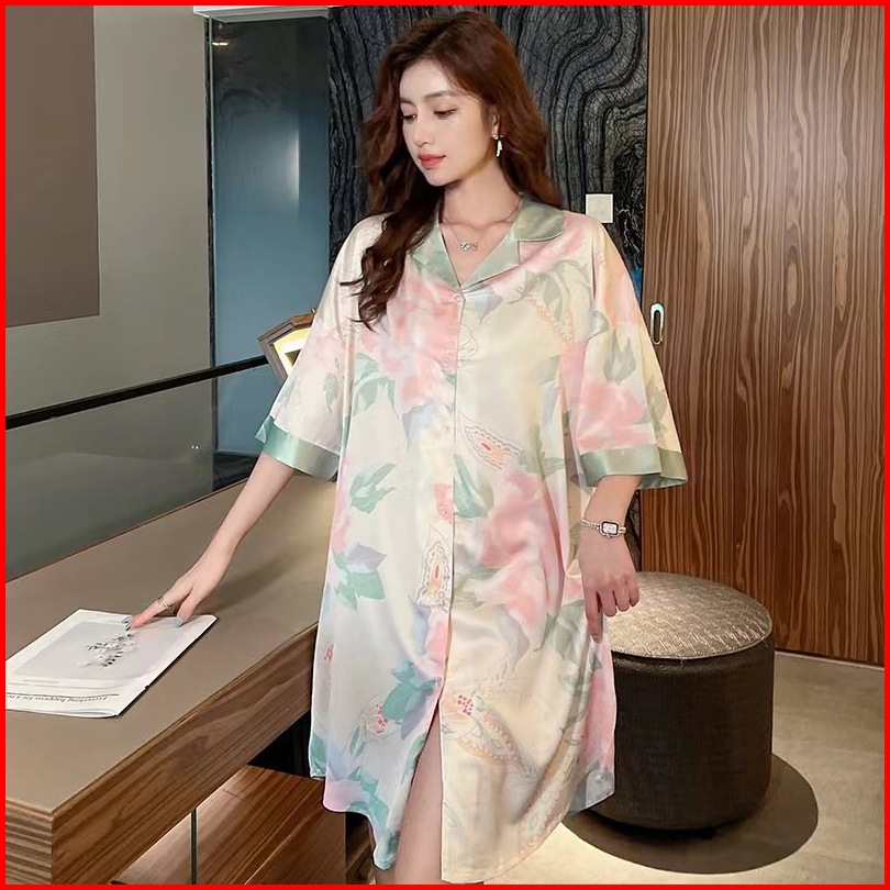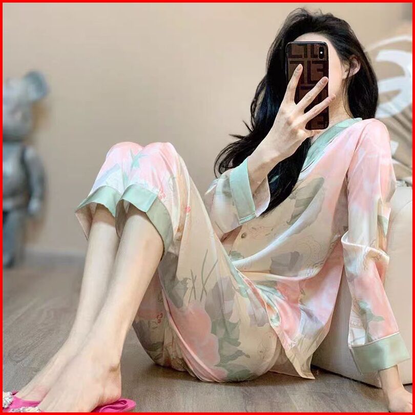 2025 Piyama Wanita Sutra Es Baju Tidur Bermotif Bunga Satin Mewah