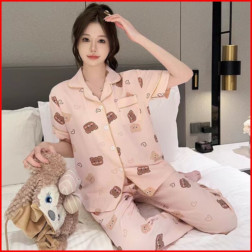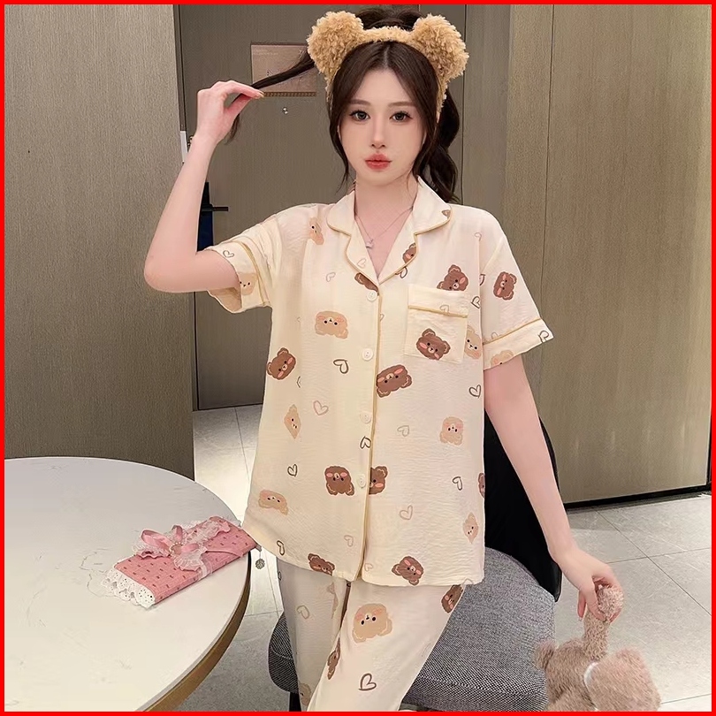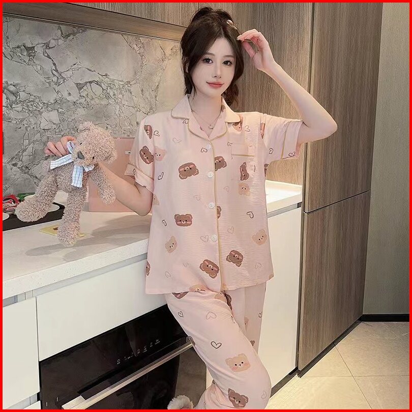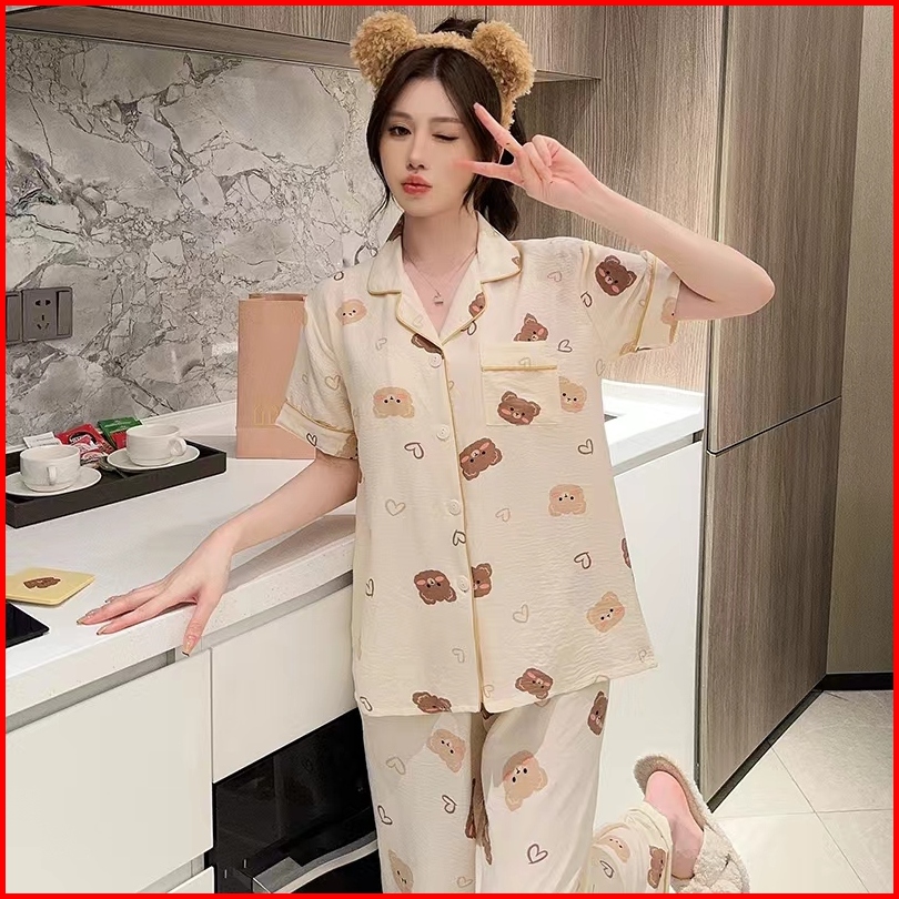2024 Piyama Wanita Baru Kerah Celana Panjang Lengan Pendek Beruang Kartun Beruang Versi Korea Setelan Pakaian Rumah Bisa