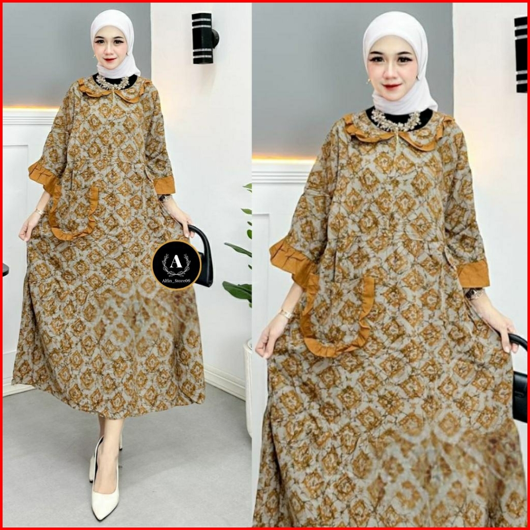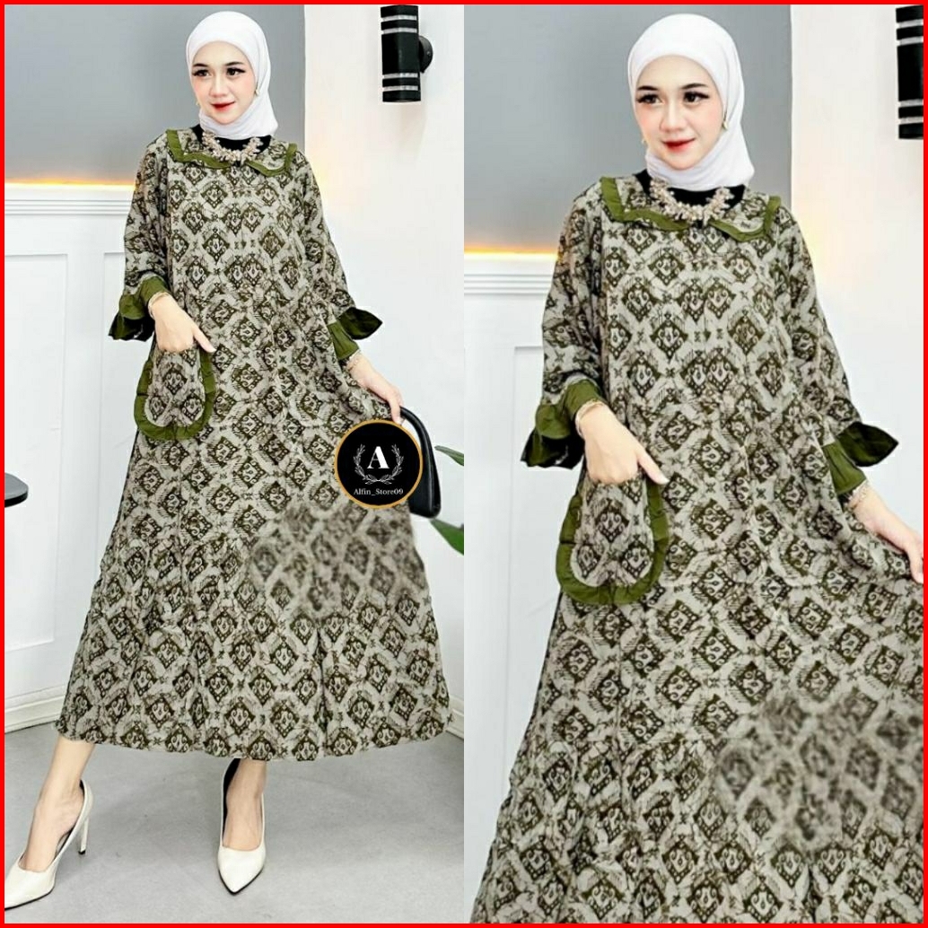 Dress Wanita Rayon Premium Dress Ruffle Midi Dress Kekinian Motif Songket Terbaru Daster Busui Resleting Depan