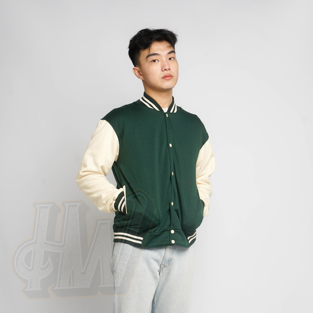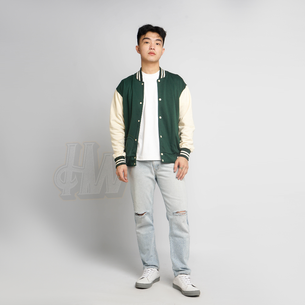 Jaket Basebal Varsity Kancing Hijau Tangan Cream Polos Pria dan Wanita Unisex M-XXL