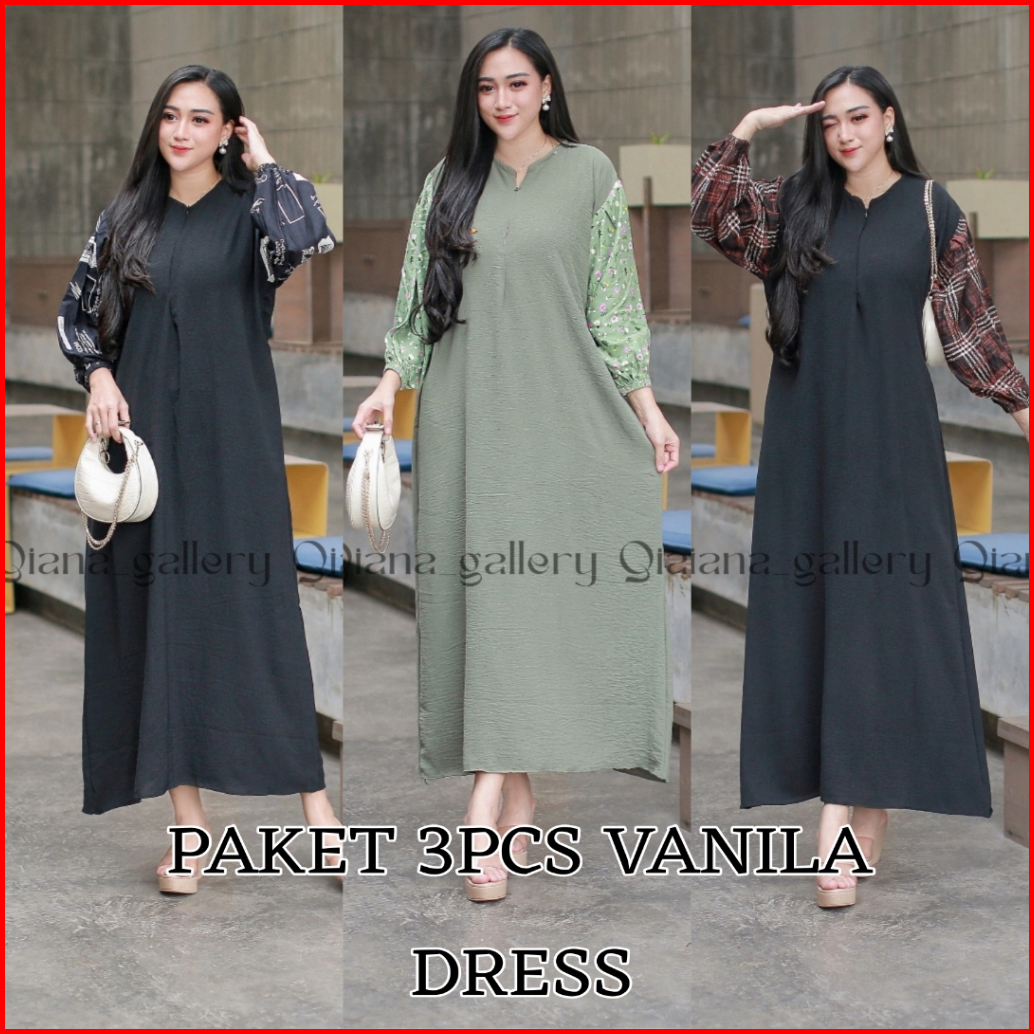 Paket 3pcs Vanila Dress Ld 120cm Pb 130cm Lengan Balon Cringkle Mix Rayon Premium