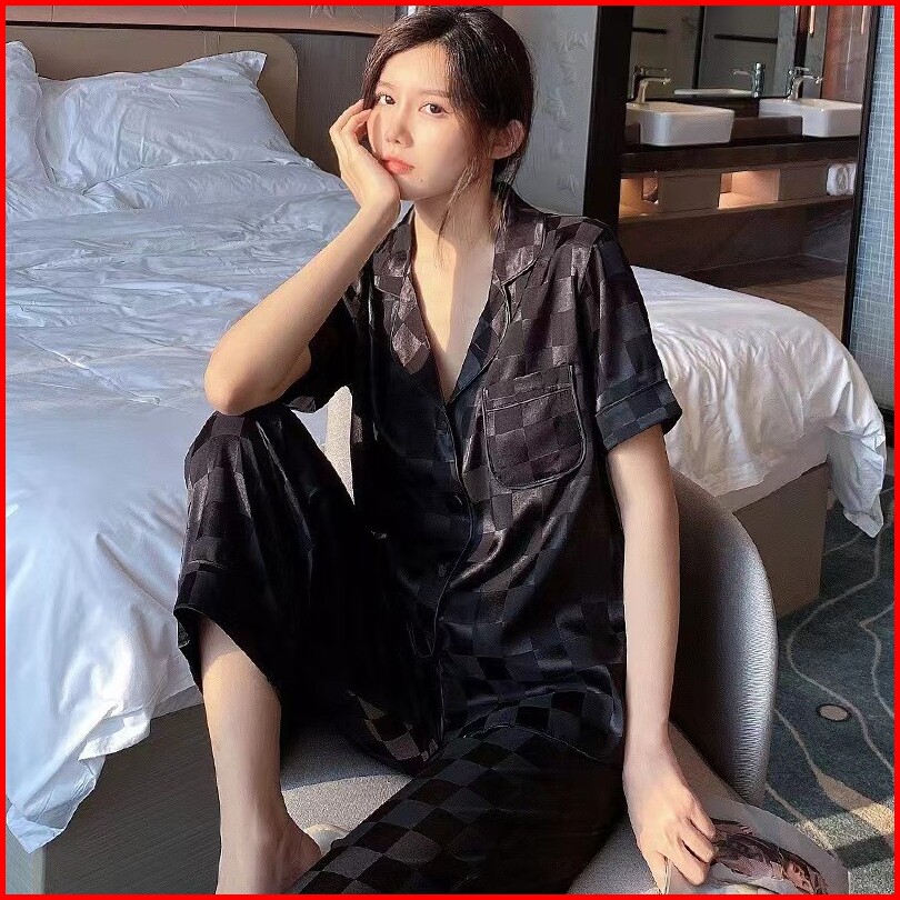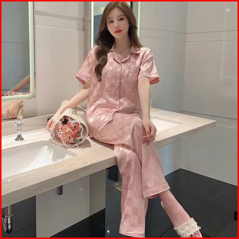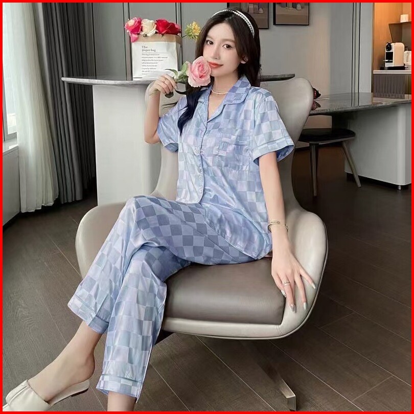 Baju Tidur Piyama Wanita Sutra Es Piyama Lengan Pendek Kotak-kotak Celana Panjang Daster
