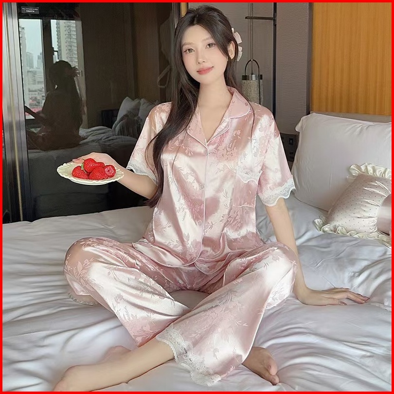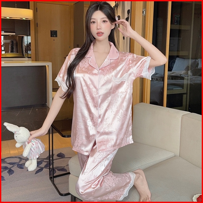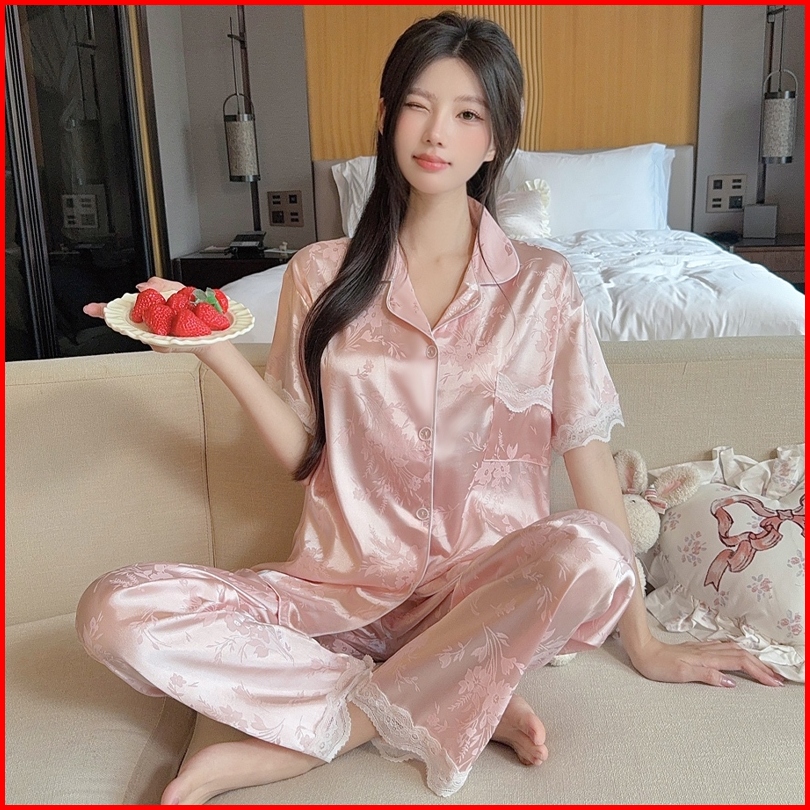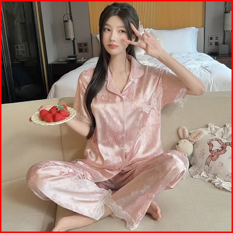 2025 Koleksi Pakaian Tidur Premium Gaya Prancis Berwarna Pink Dengan Motif Jacquard Dan Bahan Sutra Es Untuk Wanita Set