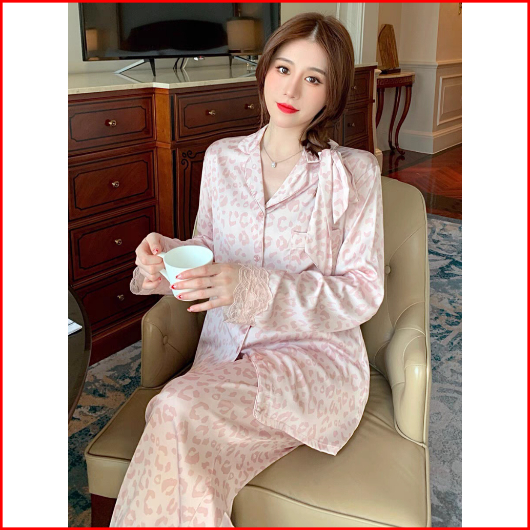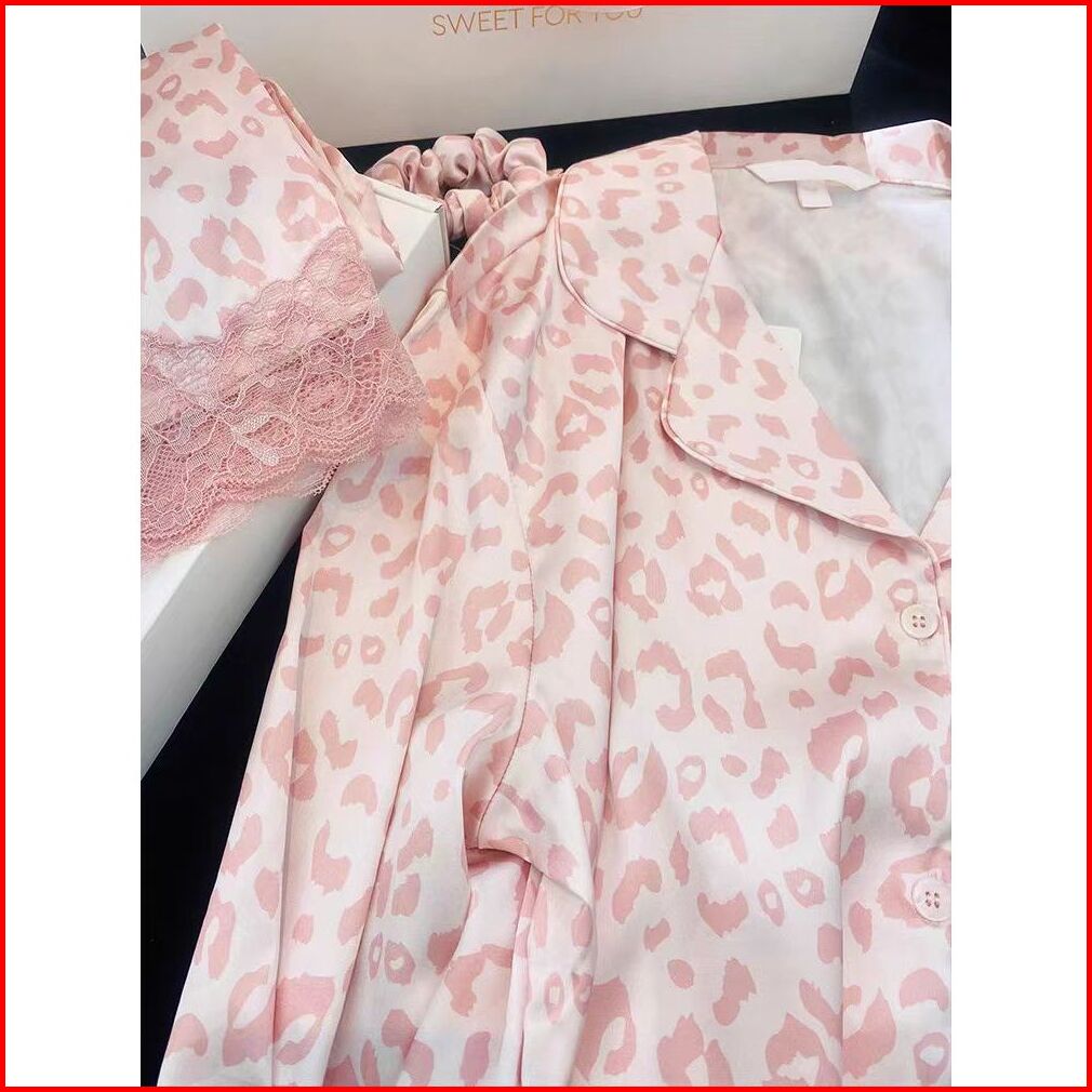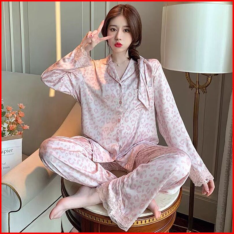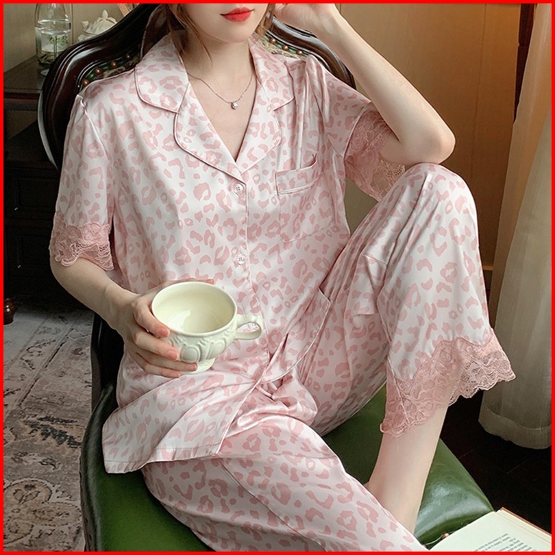 2025 Piyama Satin Motif Macan Tutul Baru Renda Dipotong Lengan Panjang Set Pakaian Santai Celana Panjang