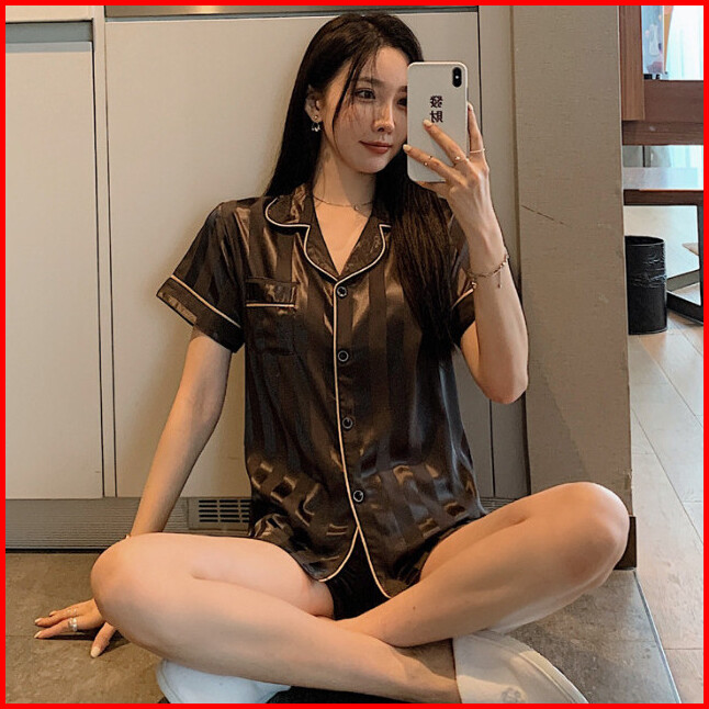 Pakaian Tidur Wanita Bergaris Dengan Lengan Pendek Berbahan Sutra Es Untuk Penggunaan Di Rumah.