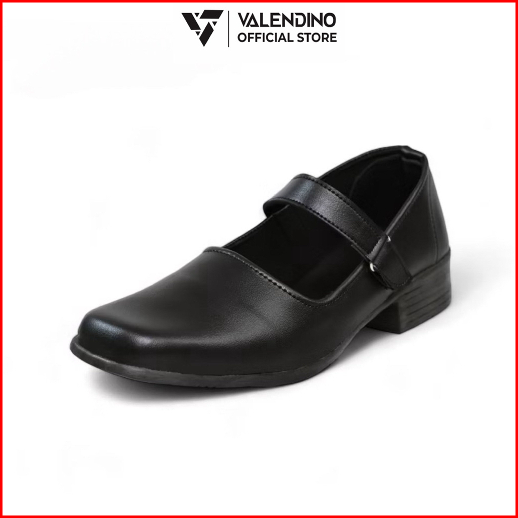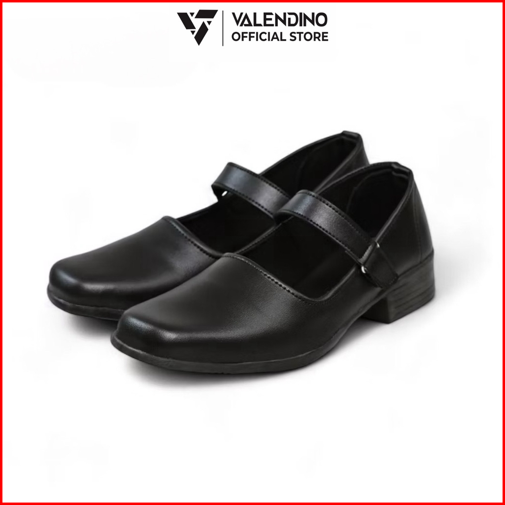Valendino Sepatu Pantofel Wanita Hitam Hak 3 Cm Kancing Rekat Sekolah Kerja Kantor