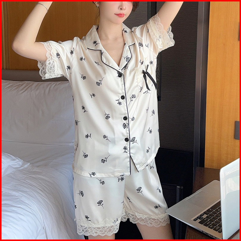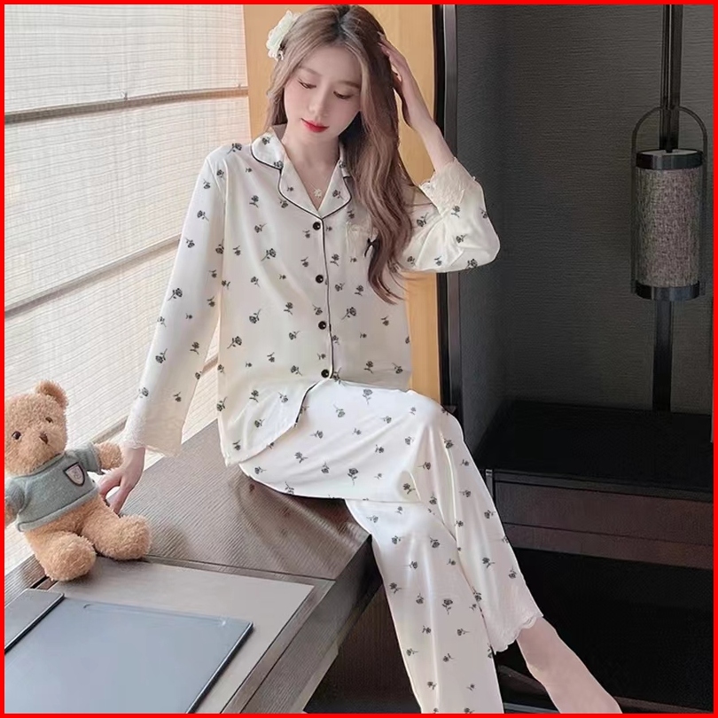 Piyama Wanita Renda Mawar Hitam Pakaian Tidur Piyama Lengan Panjang Satin
