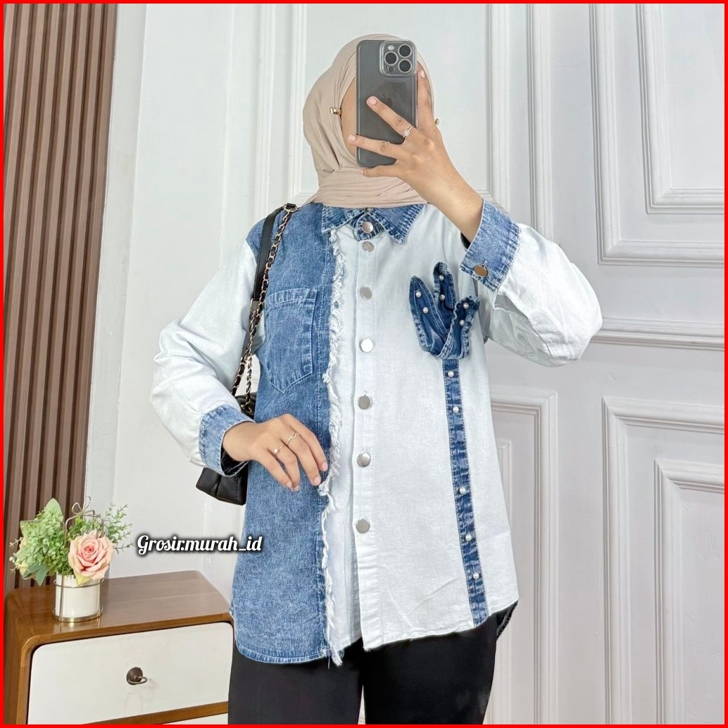 Verita Blouse Jeans Kombinasi Rayon Twill Hitam Bata Ice Blue