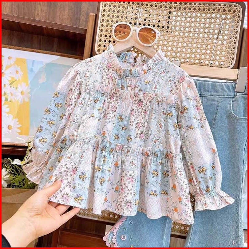 Kd14 Setelan Set Anak Perempuan Blouse Bunga Celana Panjang Jeans
