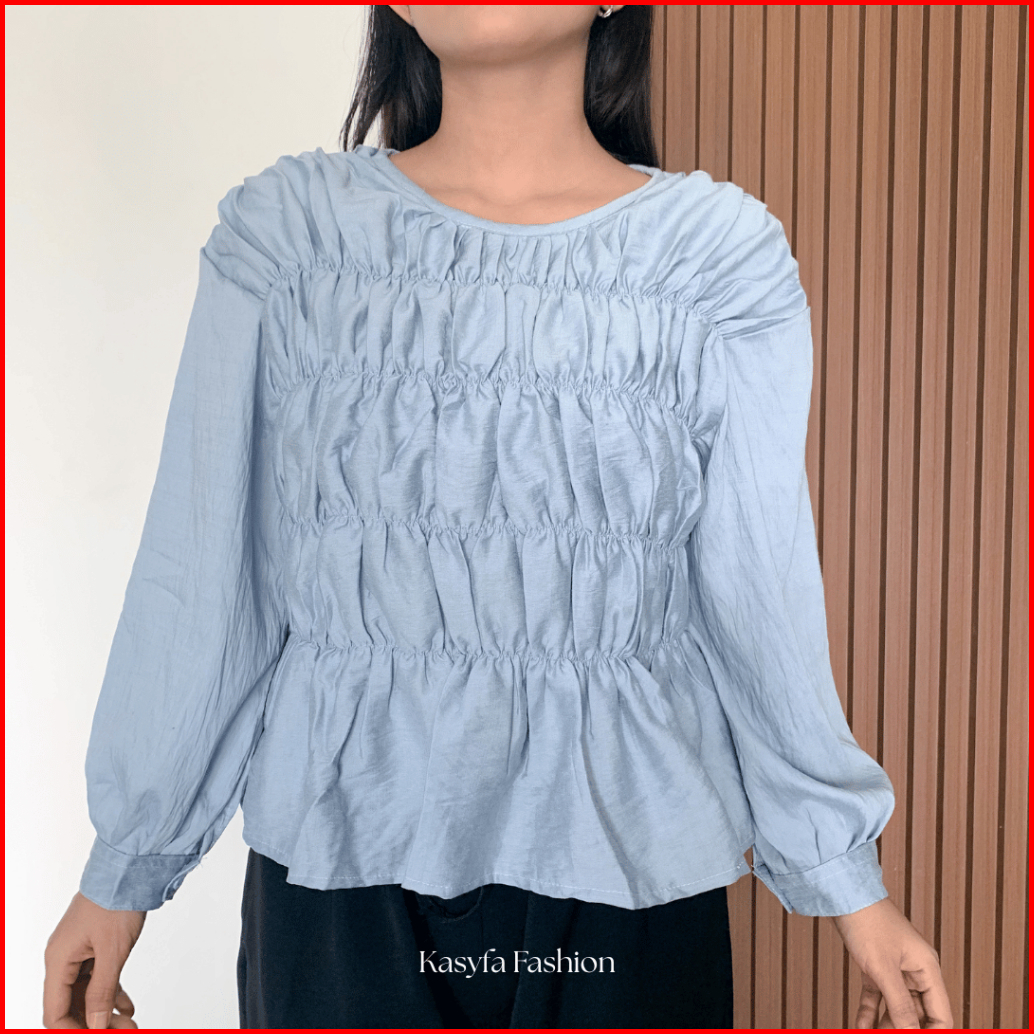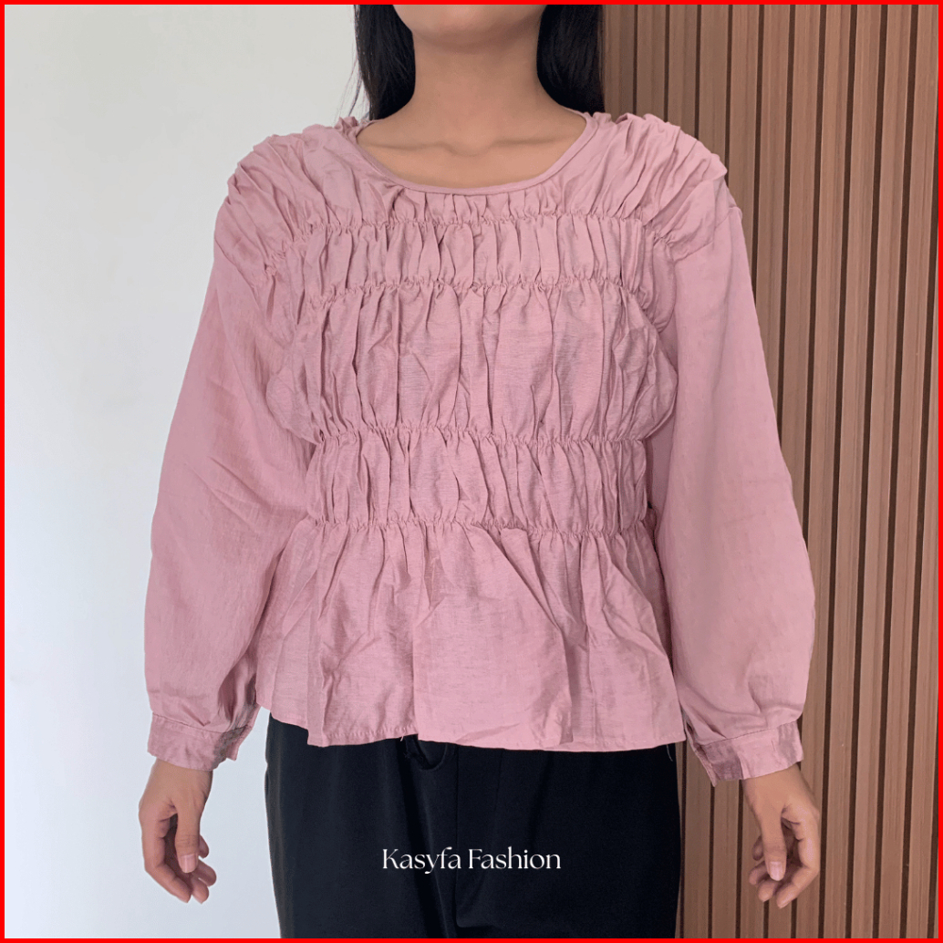 Atasan Shirred Blouse Wanita Kerut Depan Polo Linen Keenan