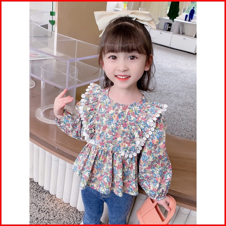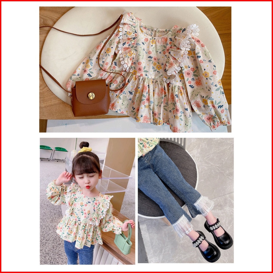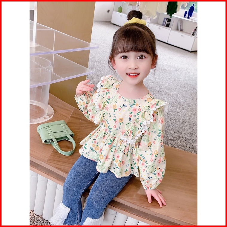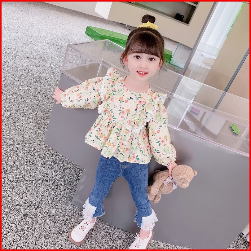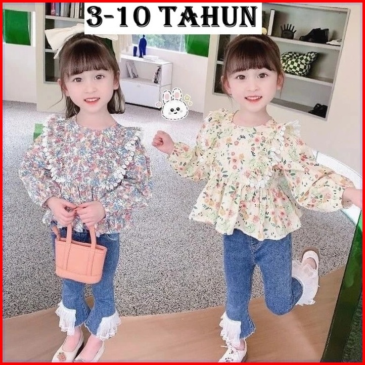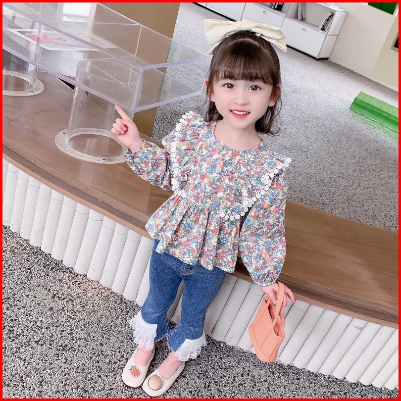 Kd83 Best Seller Setelan Set Anak Perempuan Blouse Bunga Celana Panjang Jeans Lace
