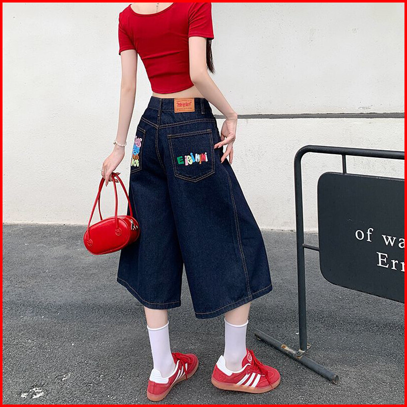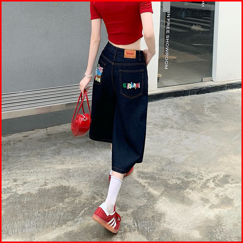 Celana Pendek Denim Pinggang Tinggi Wanita Celana Pendek Denim Grafiti Huruf Warna-warni