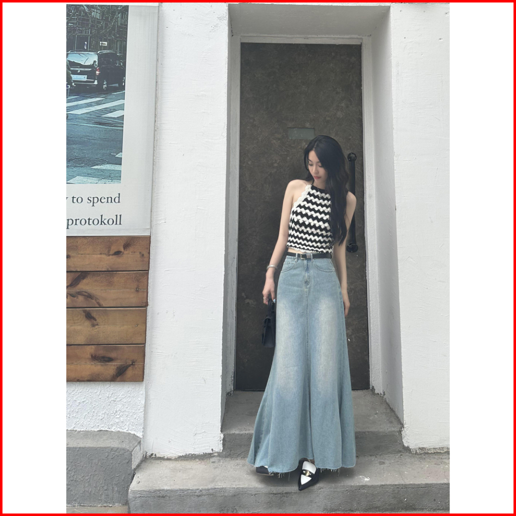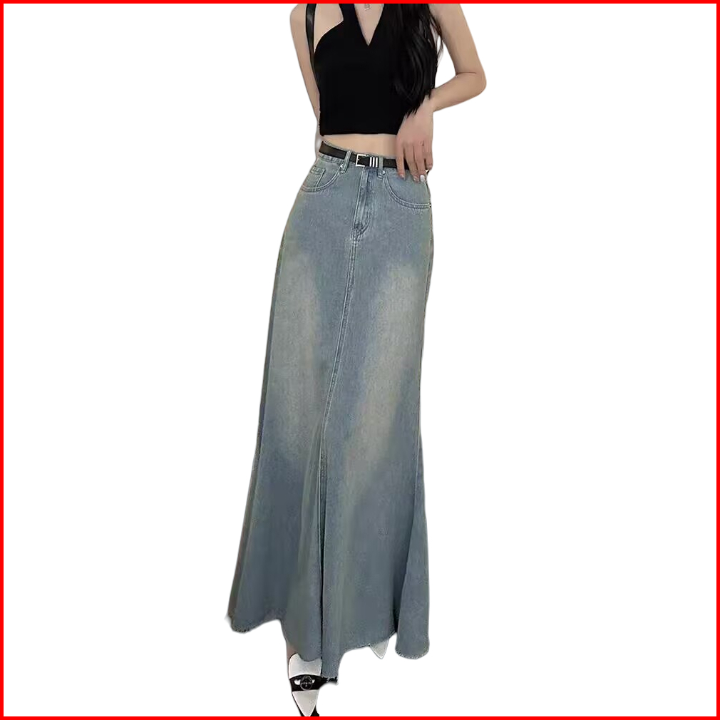 Katermen Rok Ekor Ikan-rok Denim Retro Pinggang Tinggi Korea-rok A-line-rok Denim Panjang