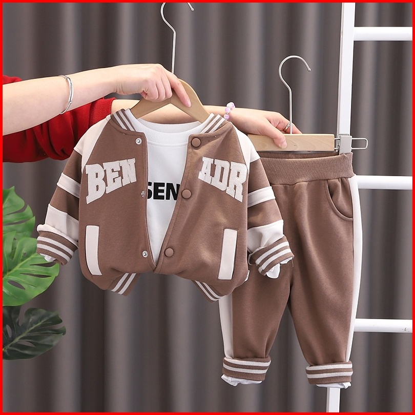 Kd55 Setelan Baju Anak Cowok Laki 3in1 Set Kaos Jaket Bomber Celana Panjang