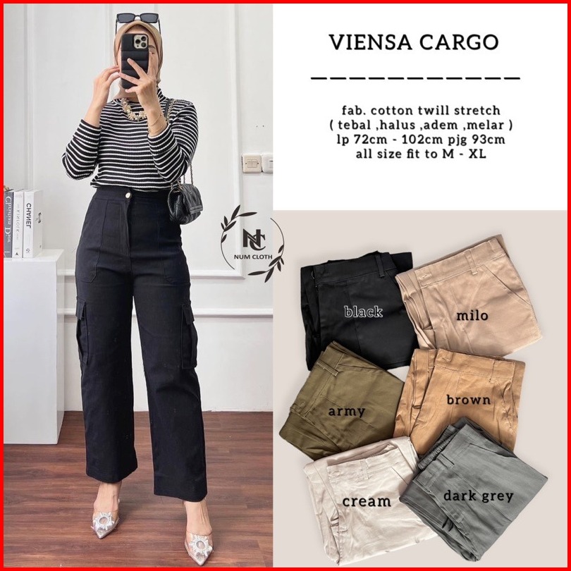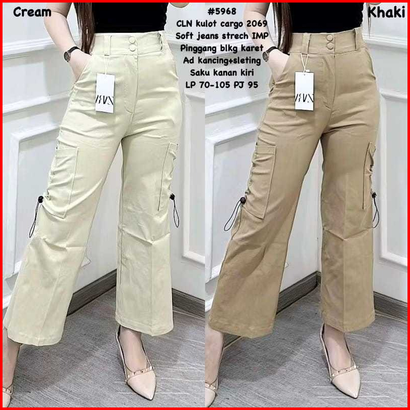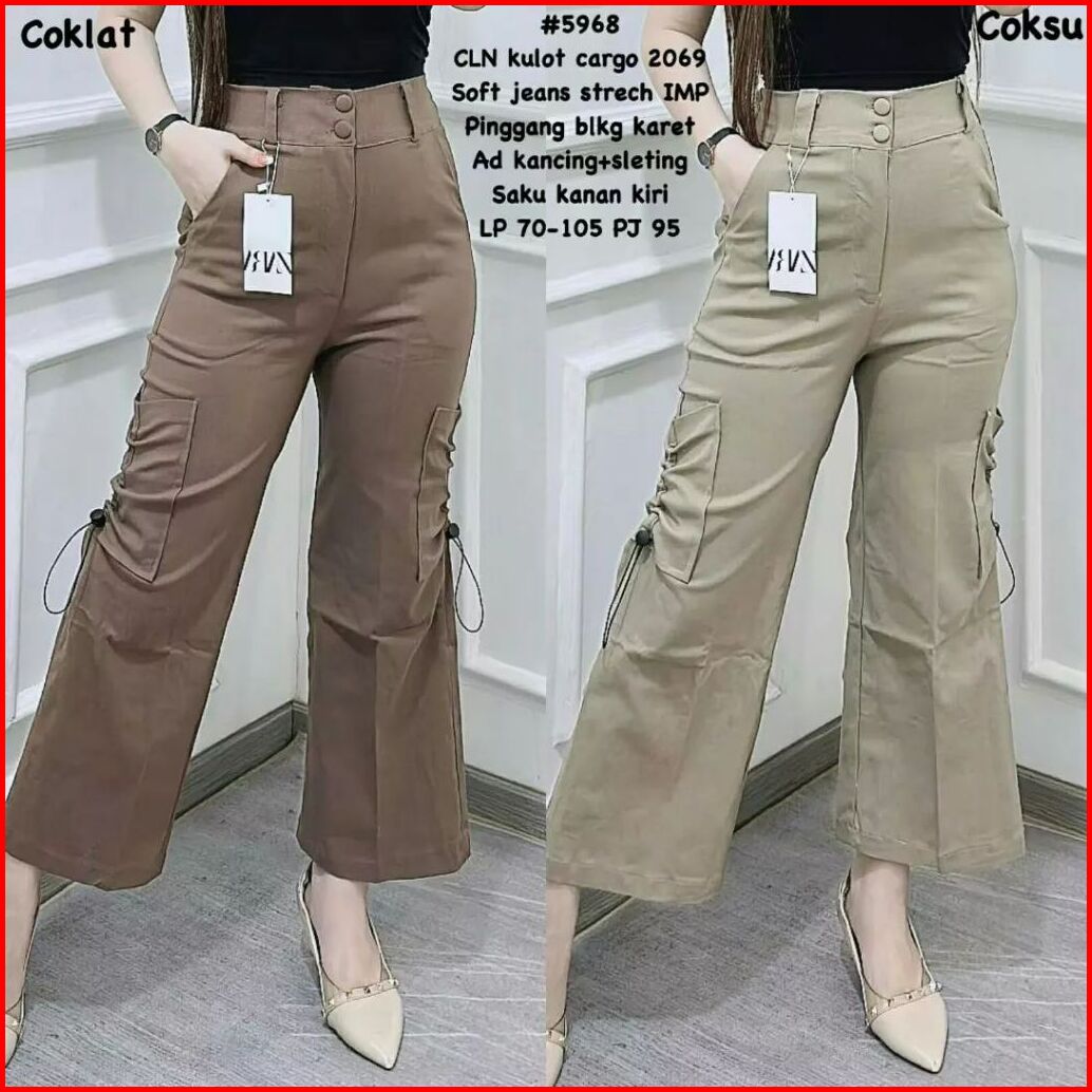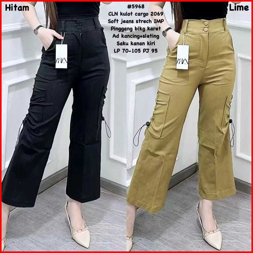 Highwaist Kulot Cargo Wanita Saku Serut Twill Combed