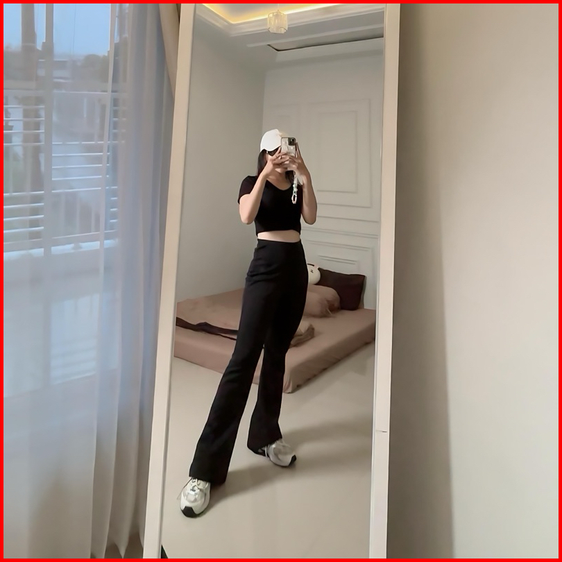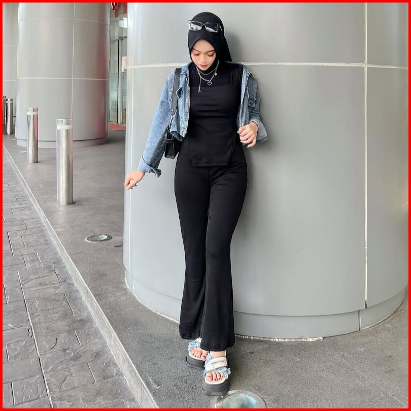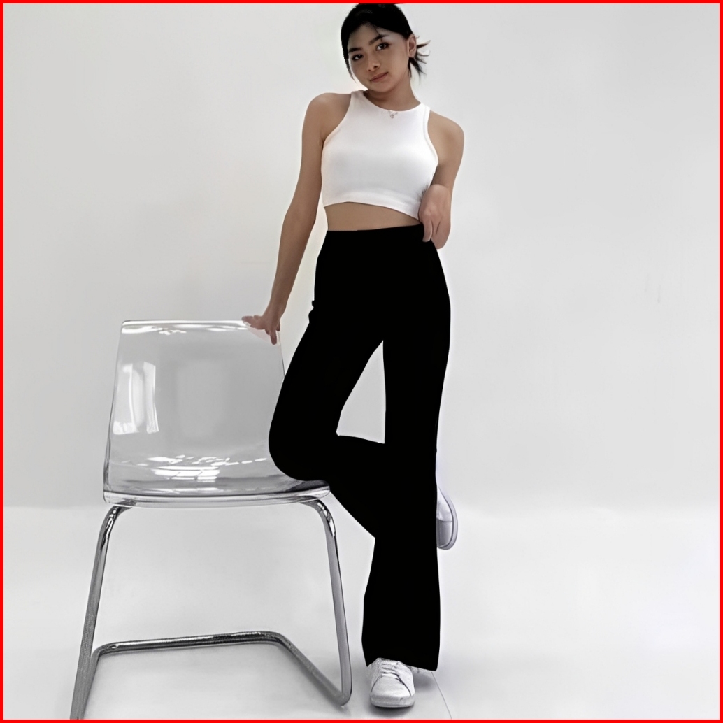 Flare Pants Highwaist Scuba Pinggang Karet Kulot Cutbray Wanita