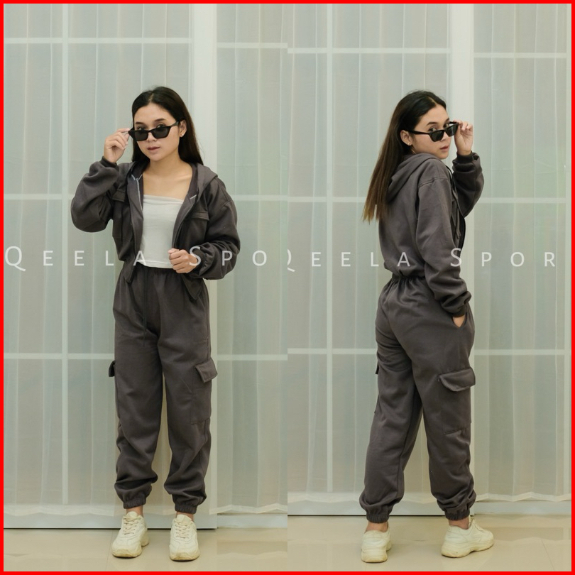 Qeelaofficial - One Set Bundle Pack Crop Hoodie Zipper X Cargo Sweatpants Jogger Korean Style