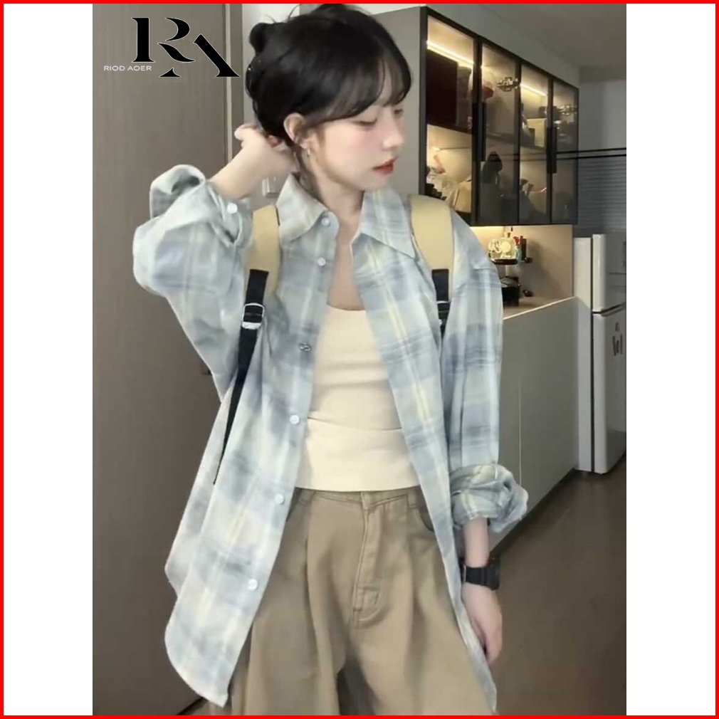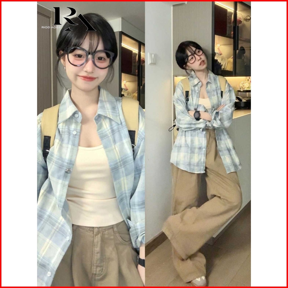 Riod Aoer Jaket Kemeja Kotak-kotak Biru Ceruk Desain Prancis Musim Semi Awal Musim Semi Pakaian Wanita 2025 Musim Panas