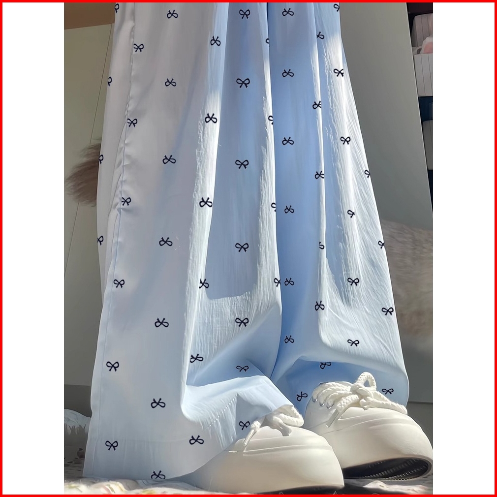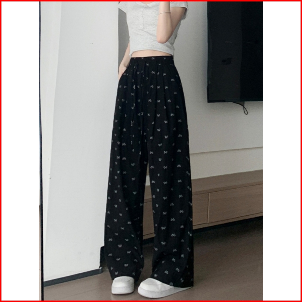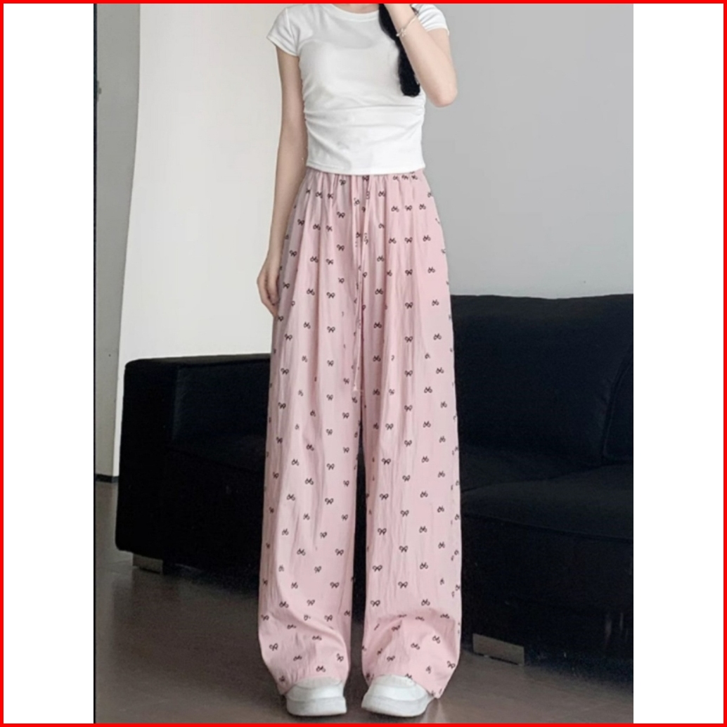 2toyoung Nlonke-celana Kasual Motif Pita Celana Kaki Lurus Longgarwanita Celana Kaki Lebar Tali Serut Celana Wanita