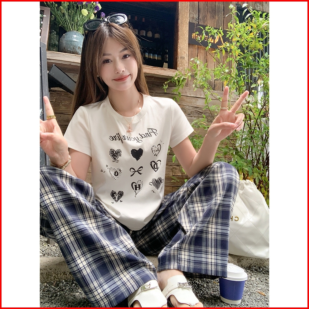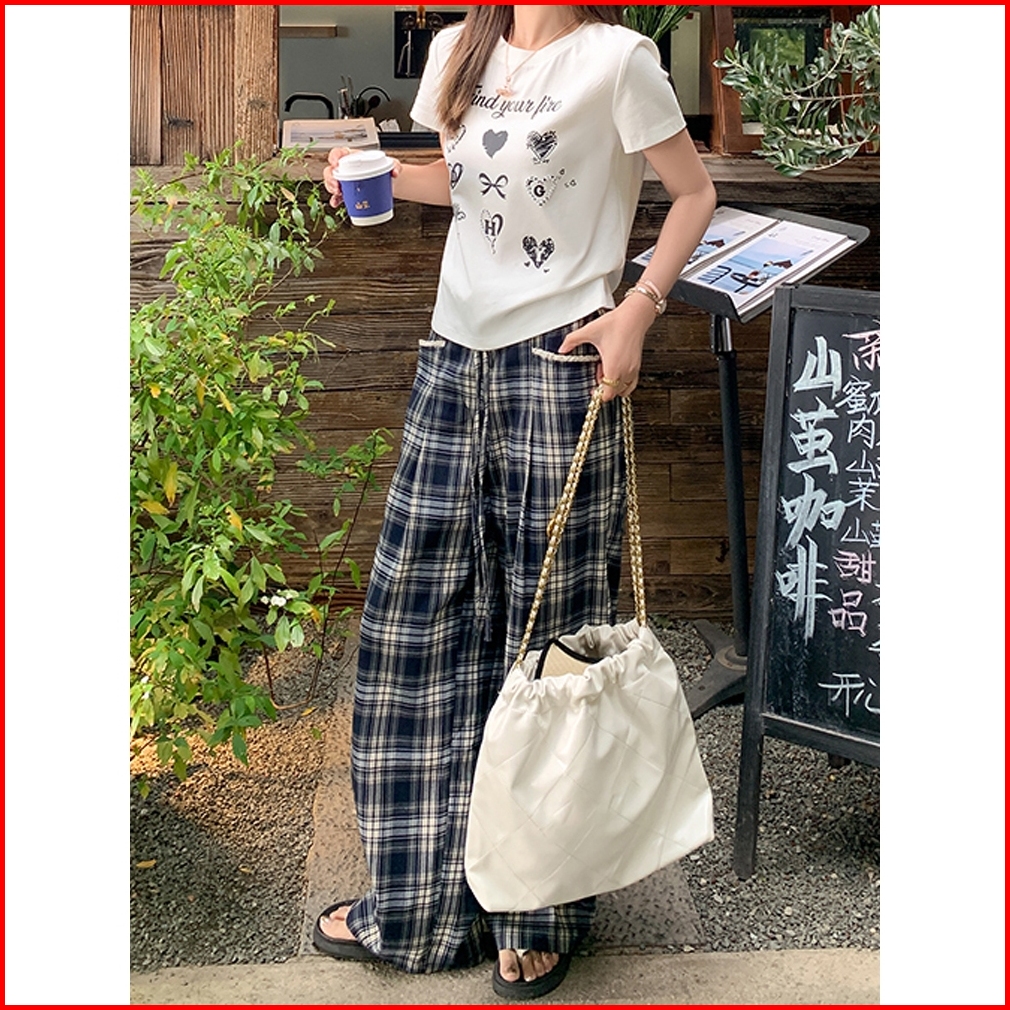 2toyoung Celana Panjang Santai Lurus Kotak-kotak Abu-abu-biru Dengan Tali Serut Celana Lebar Longgar