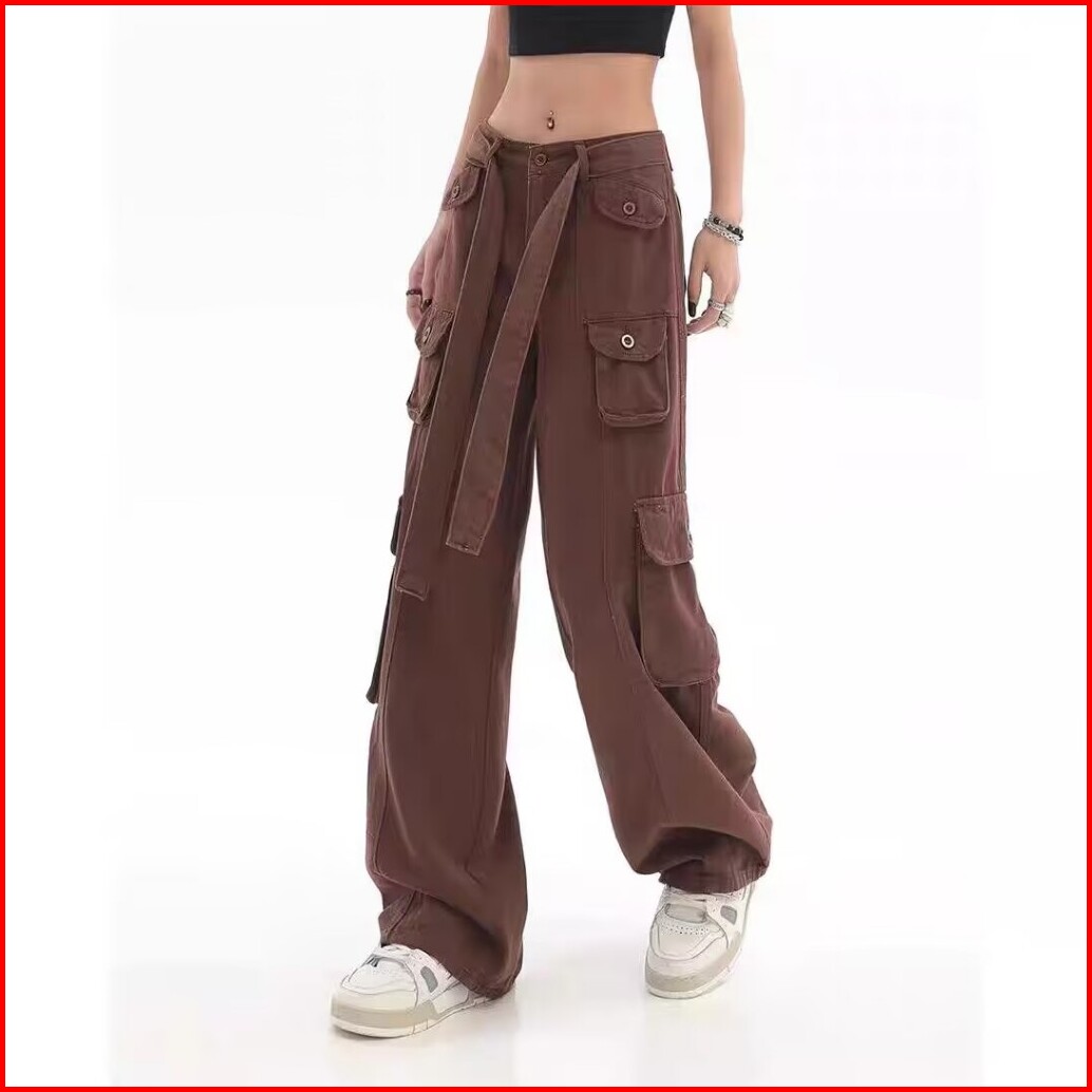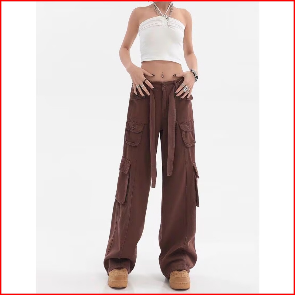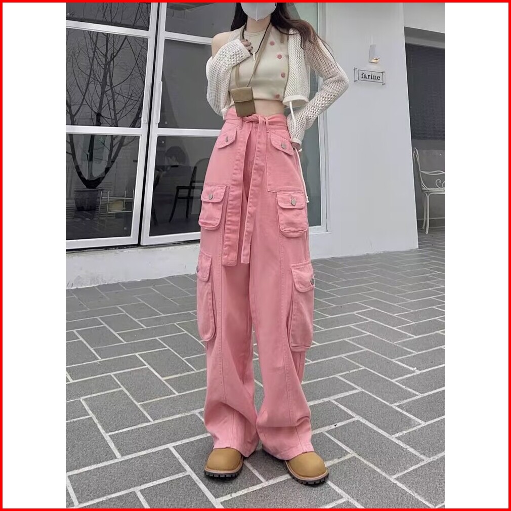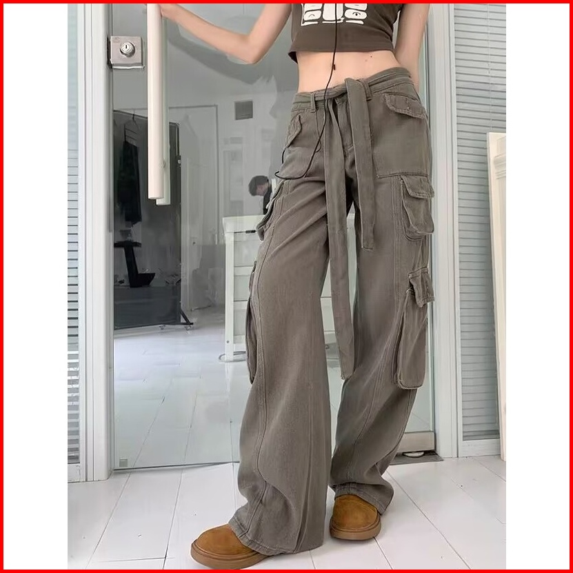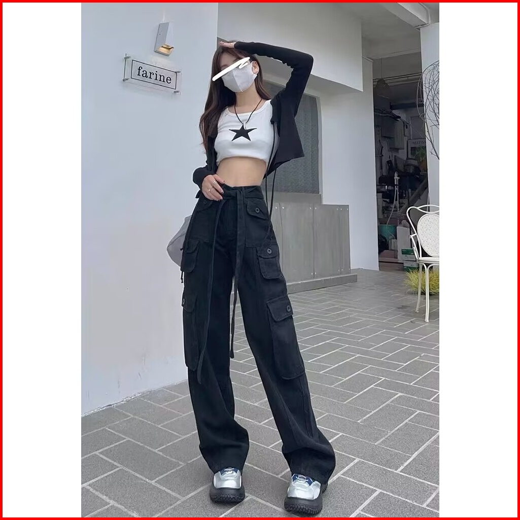 Katermen Celana Jeans Wanita Gaya Korea-pinggang Tinggi Kargo Celana- Longgar Lurus Celana Jeans