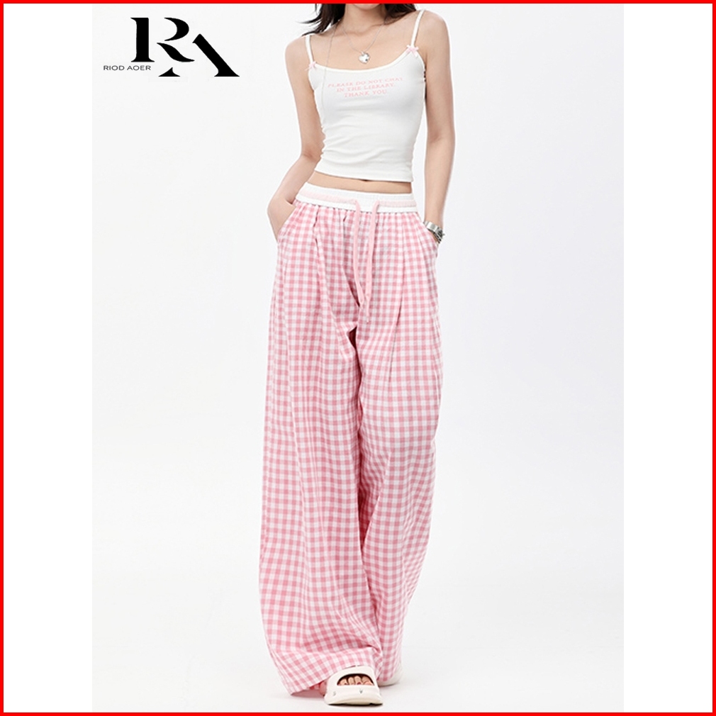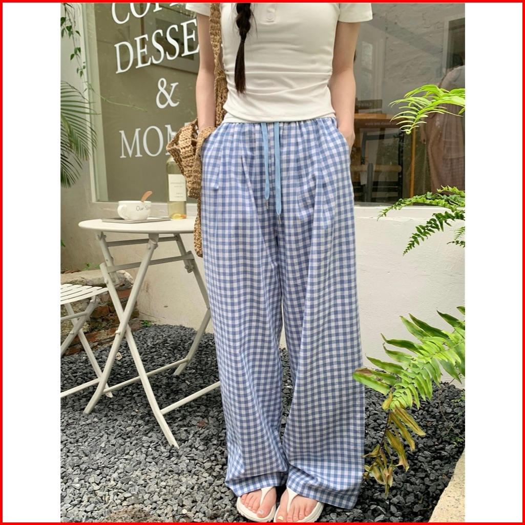 Riod Aoer Celana Panjang Lebar Kotak-kotak Biru Untuk Wanita Musim Panas Tipis 2025 Baru Kecil Pinggang Tinggi Longgar L