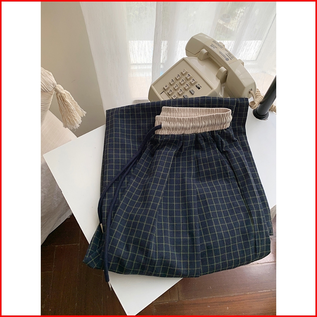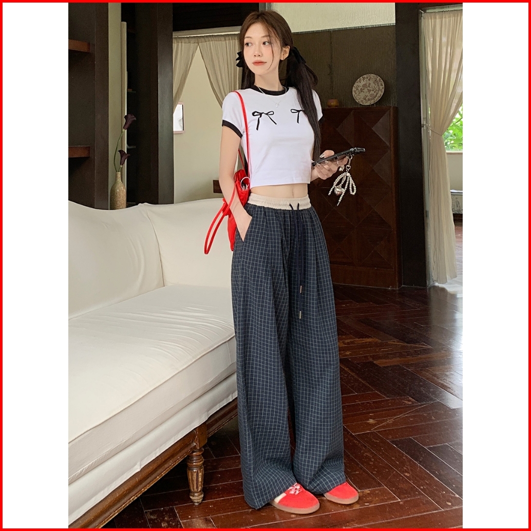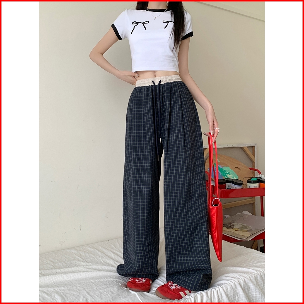 Riod Aoer Celana Kasual Kotak-kotak Retro Wanita Musim Panas Celana Lurus Pinggang Tinggi Longgar Tipis Gaya Hong Kong R