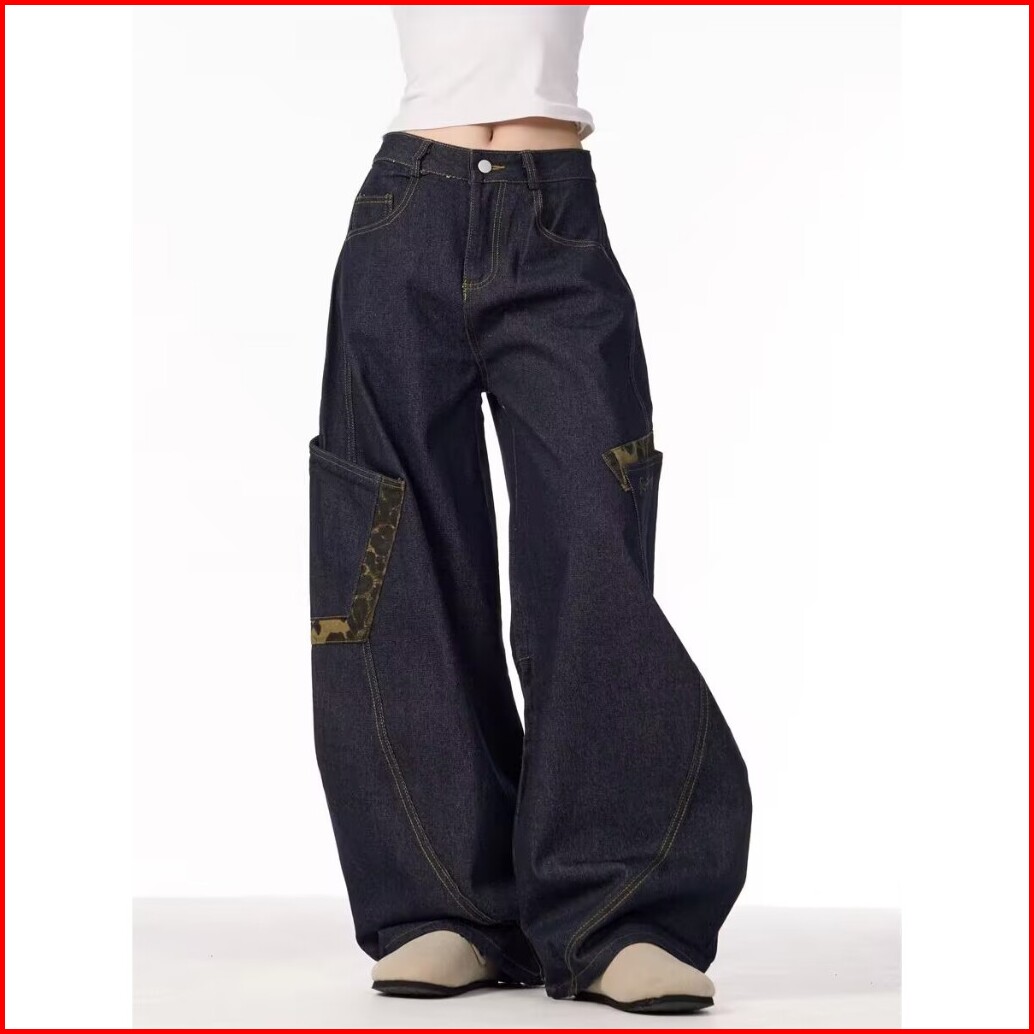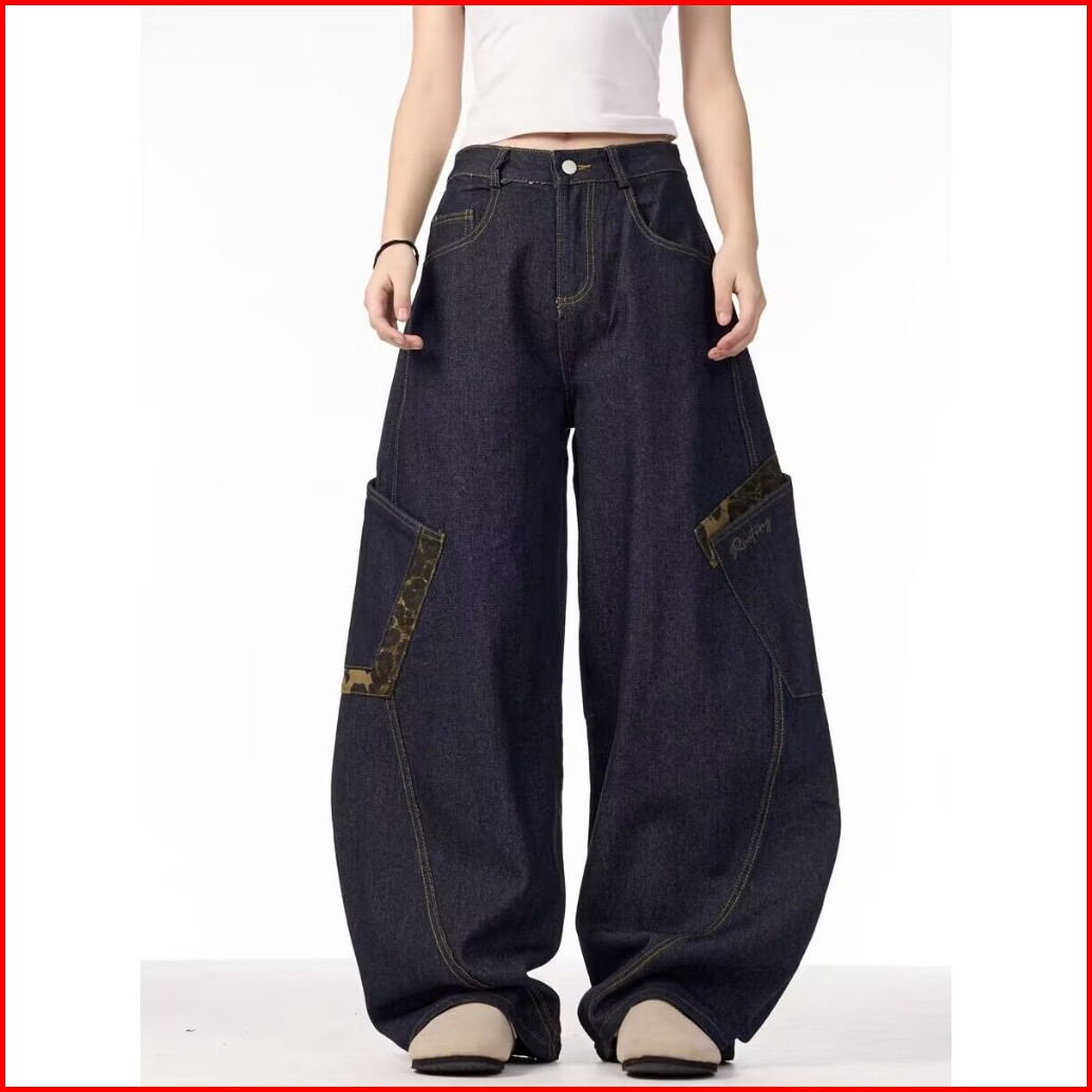 Katermen Jeans Kerja Wanita Gaya Korea Jeans Patchwork Vintage Longgar Celana Kaki Lebar Kantong