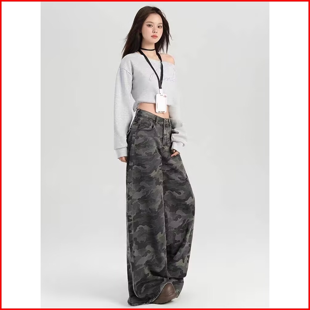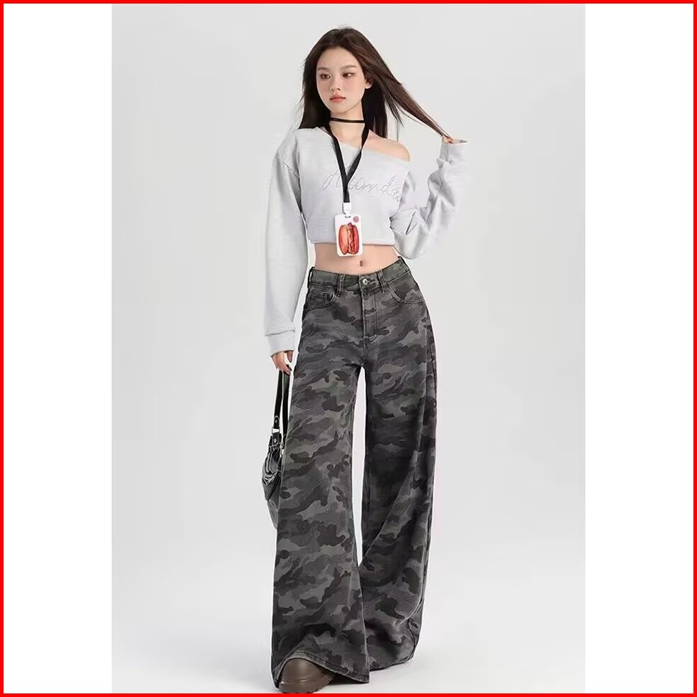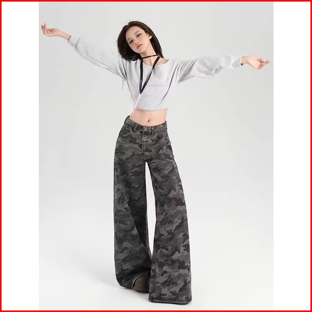 Katermen Jeans Kamuflase Wanita Gaya Pinggang Tinggi Pakaian Kerja Kaki Lebar Celana Jeans Lurus