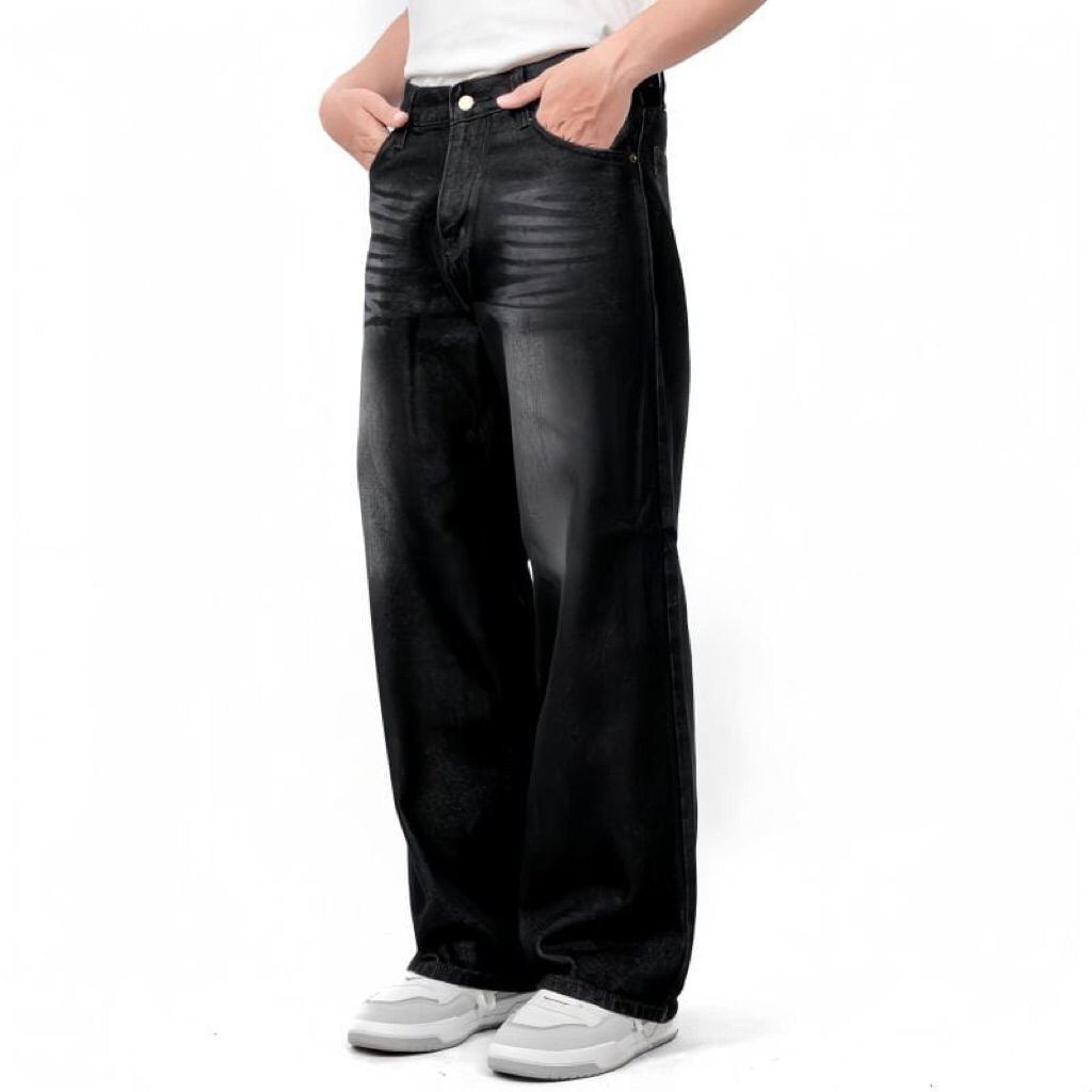 Celana Jeans Wisker Pria Unisex Wide Leg Lebar Gombrong Skena 27-34